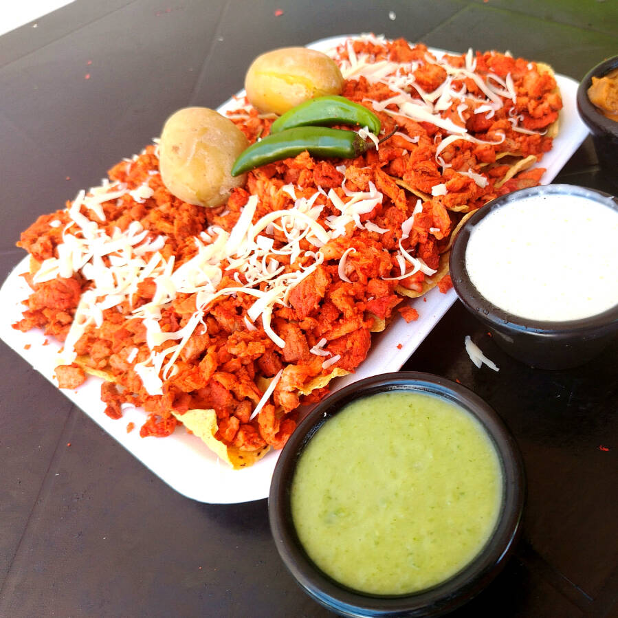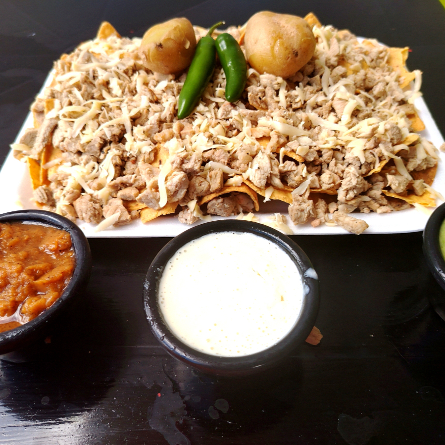 Elaborado a base de frijol, totopos, carne al pastor, cebolla y cilantro, queso fundido de alta calidad, salsa de tomate, guacamole, crema xcatic, papas cambray al estilo chino, chile serrano y limón.