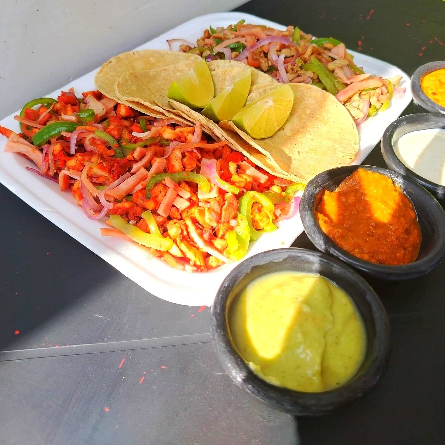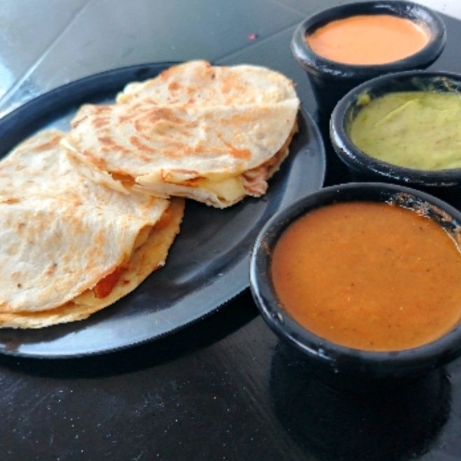 Tortillas de harina con jamón de pavo y queso gouda fundido, acompañado de crema xcatic, chimichurri y salsa roja.