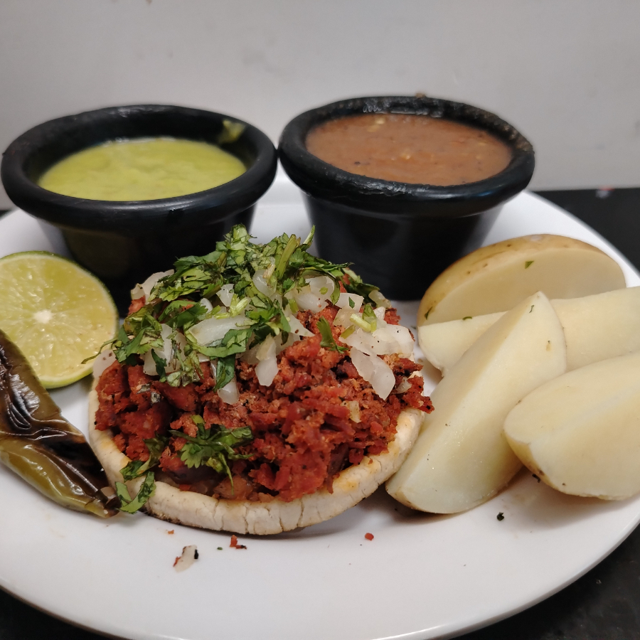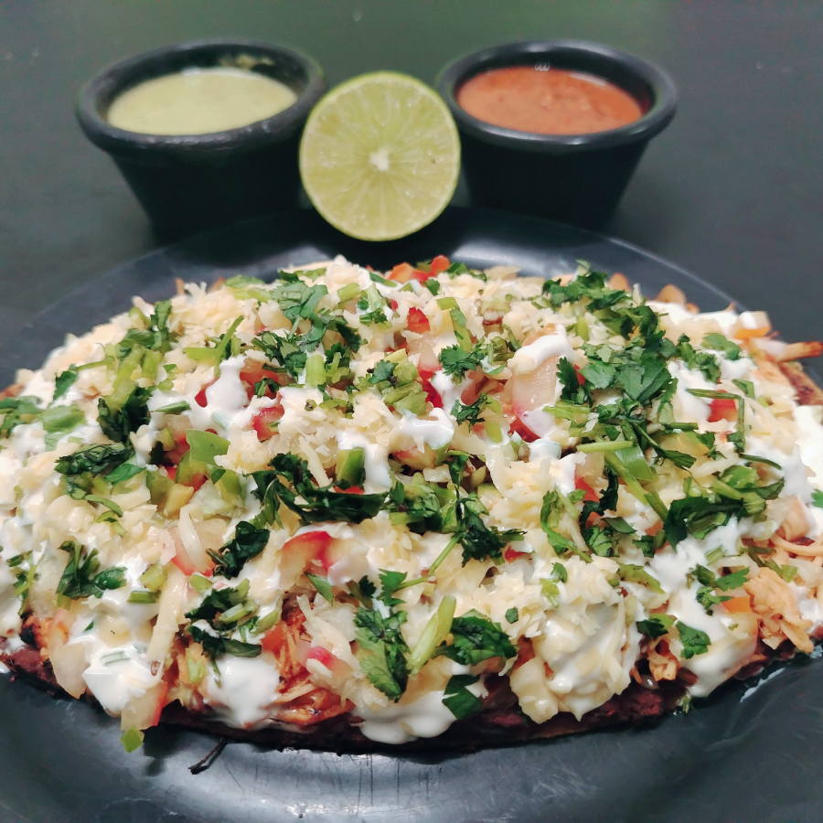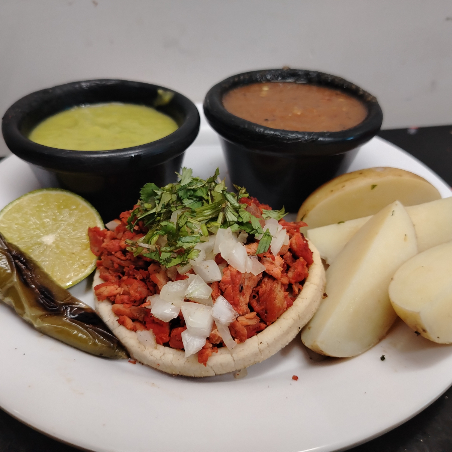 Elaborado con frijol refrito, carne al pastor, cebolla, cilantro, queso rayado fundido y se acompaña con papas cambray, chile serrano, crema xcatic, salsa Ranchera, guacamole y limón.