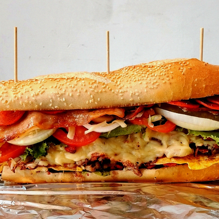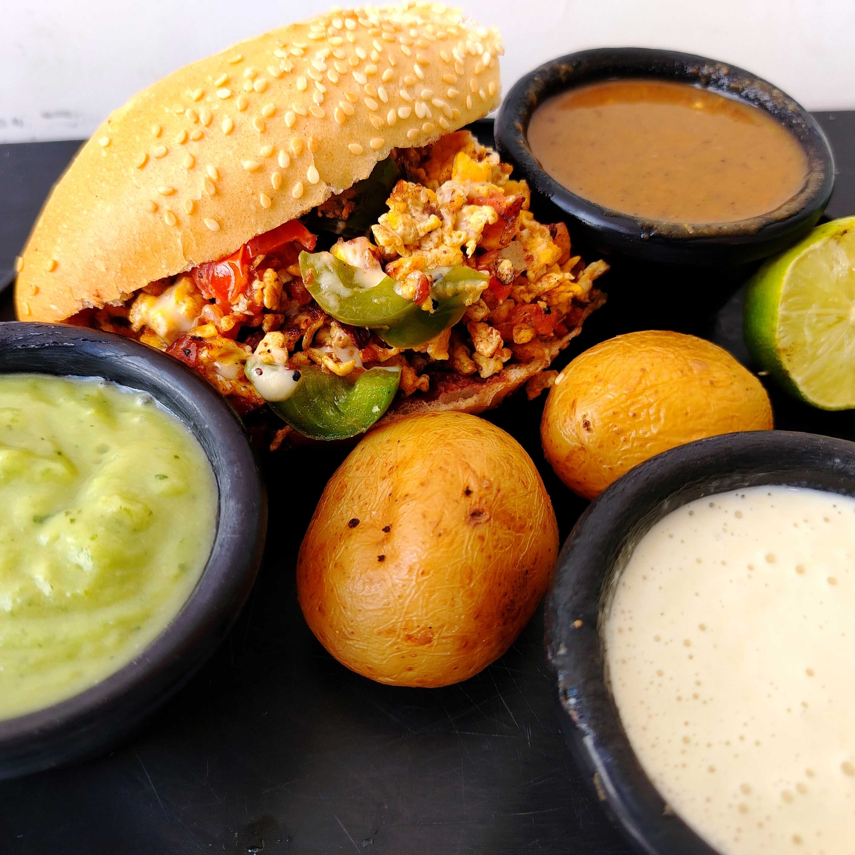 Elaborada con pan Baguett con ajonjolí, capa de frijol, huevos revueltos, chile morron, cebolla asada, jitomate y queso fundido de alta calidad, se complementa con papas cambray al estilo chino, chile serrano, salsa de tomate, guacamole y crema xcatic.