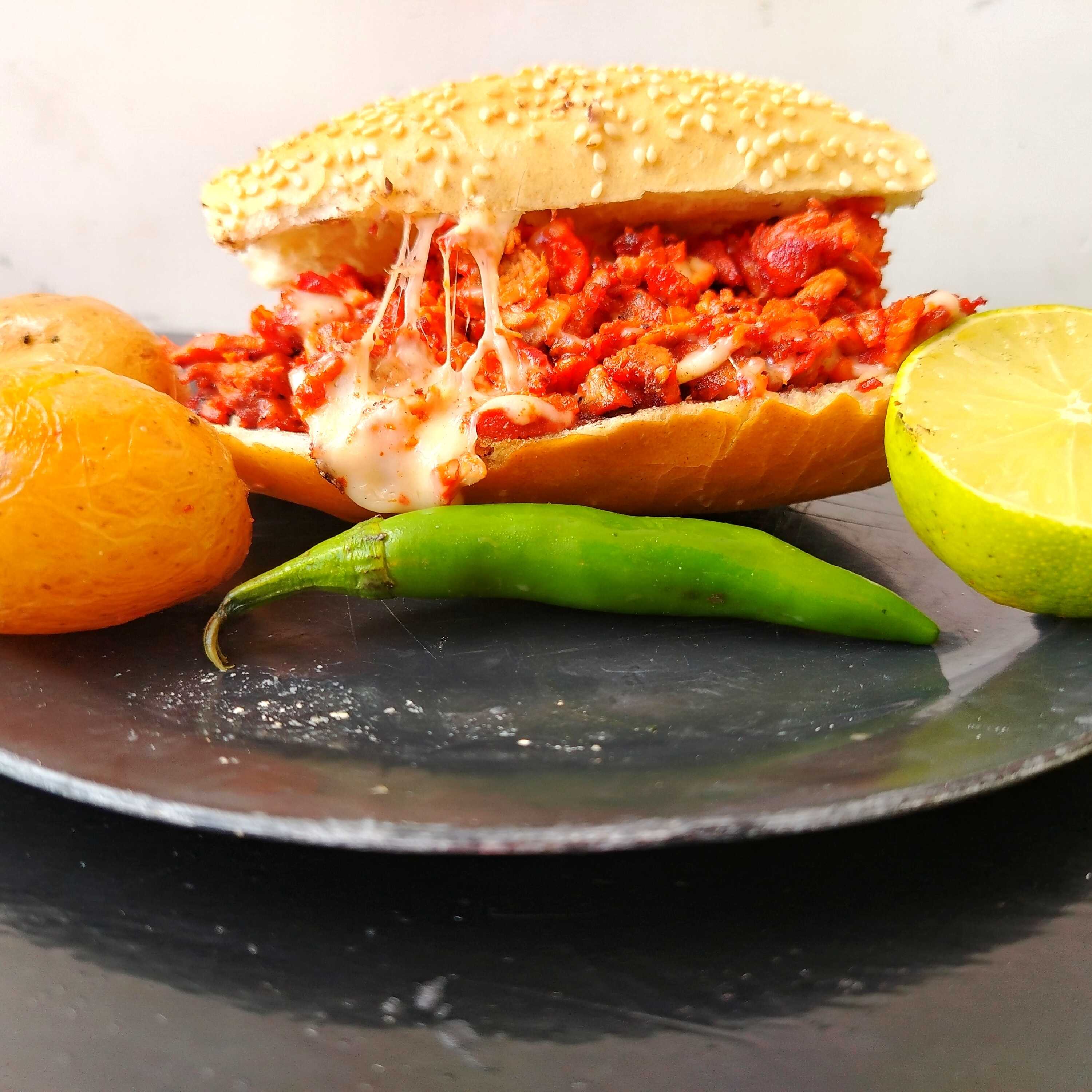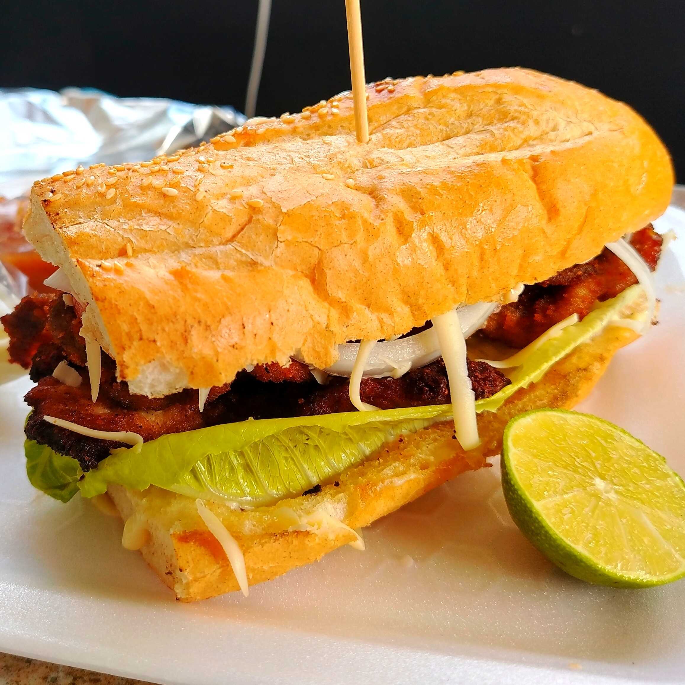 Pan Baguette con ajonjolí, capa de frijol, carne al pastor de cerdo, queso fundido de alta calidad, cebolla,cilantro, se acompaña con papas cambray al estilo chino, limón, salsa de tomate, guacamole y crema xcatic.