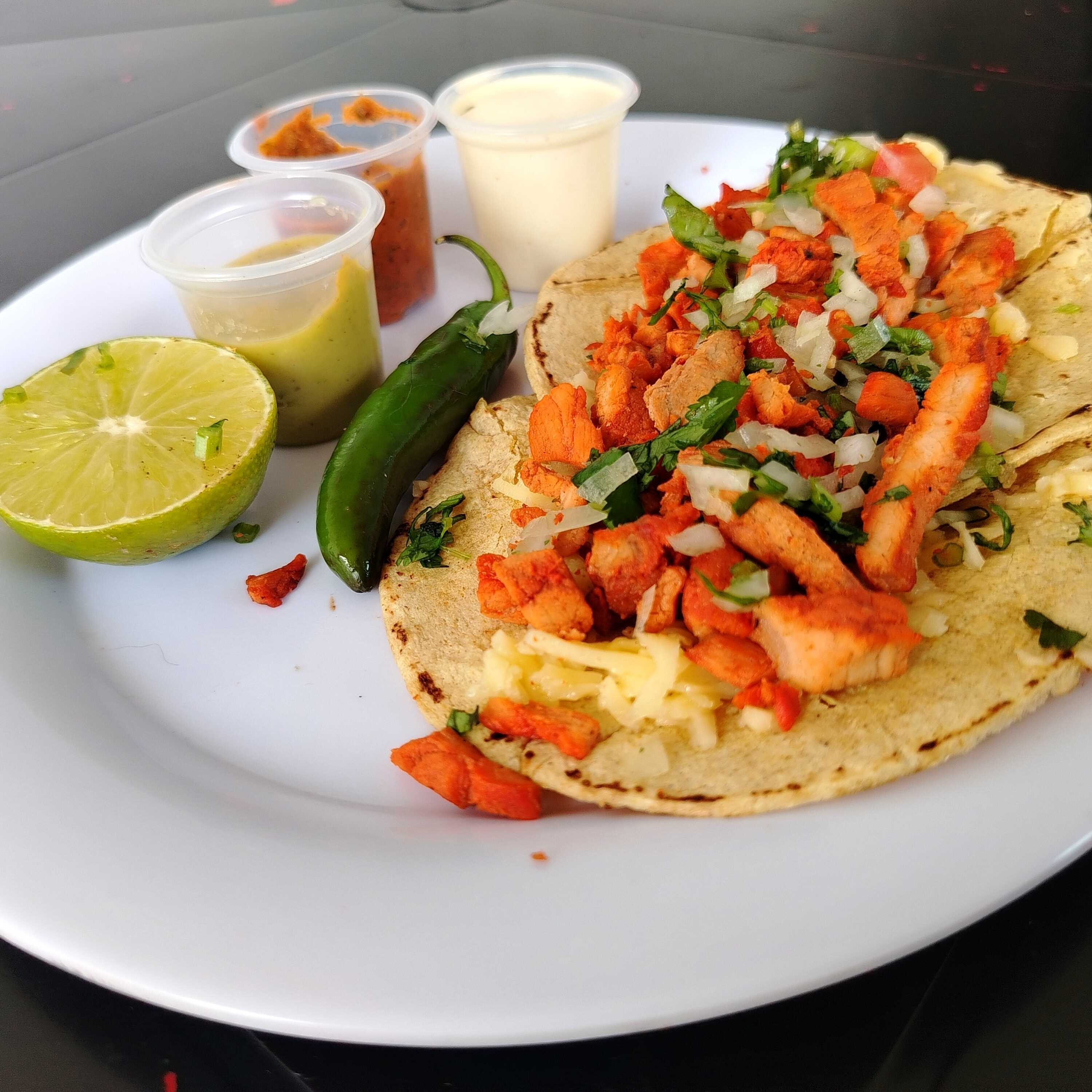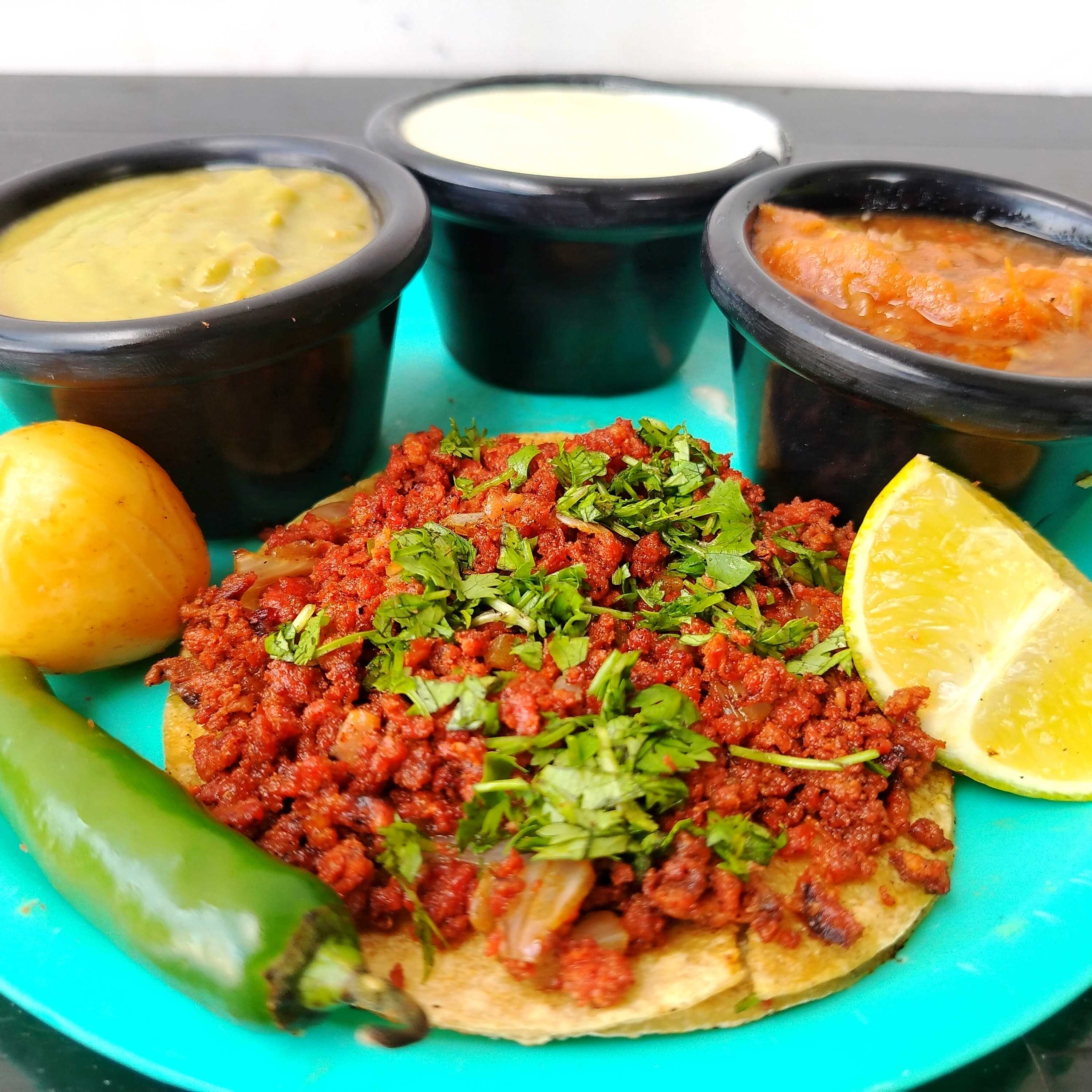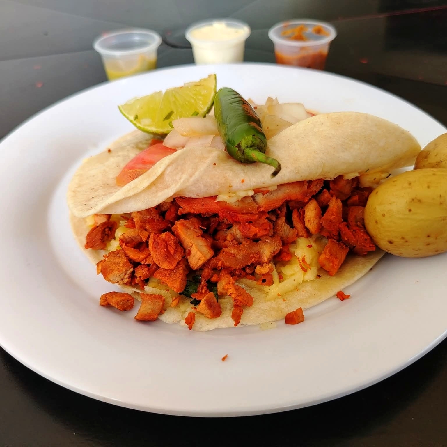 Taco de doble tortilla con carne al pastor, cebolla, cilantro, salsas, limón y chile serrano.