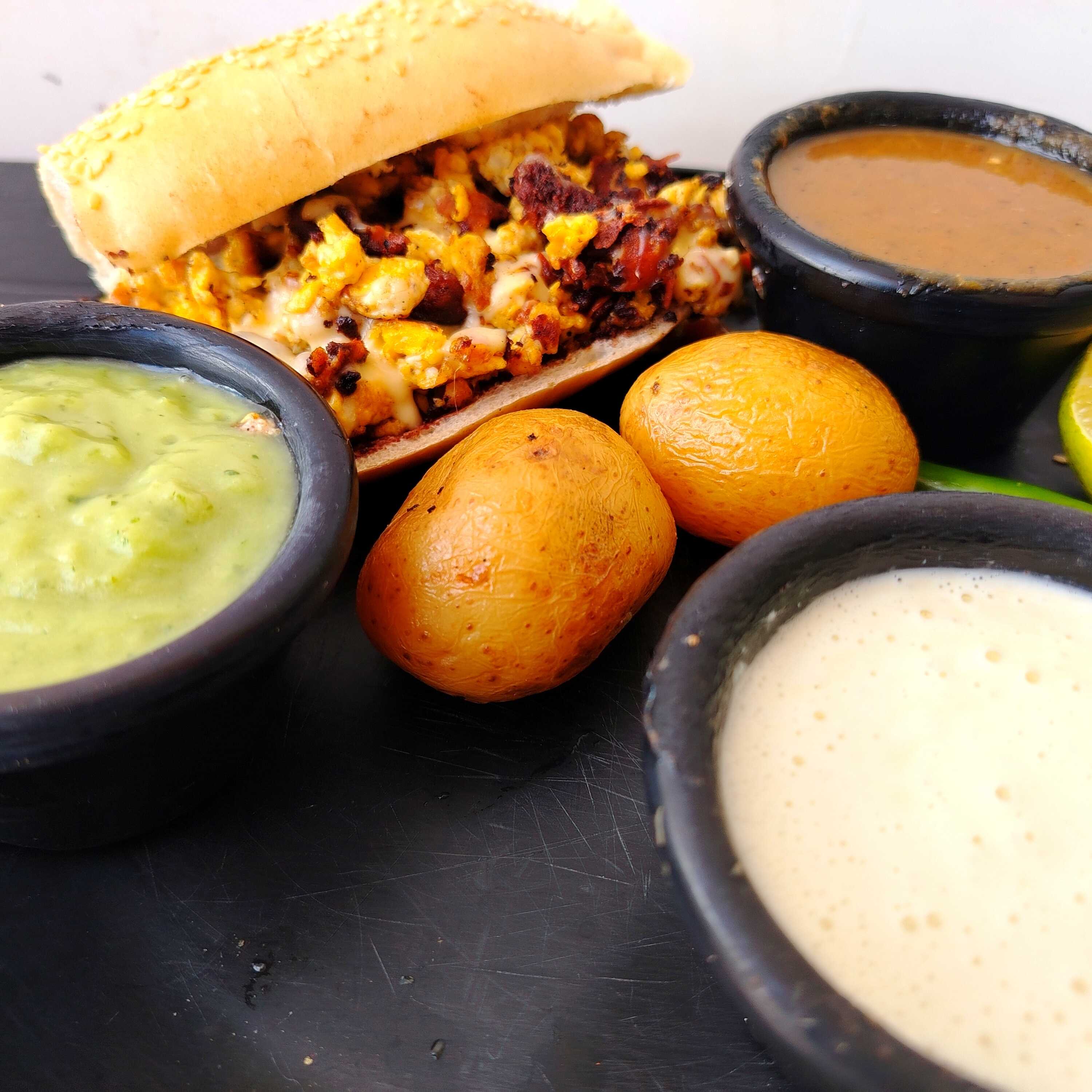 Pan Baguette con ajonjolí, capa de frijol, longaniza ahumada, queso fundido de alta calidad, cebolla asada, cilantro, acompañada de papas cambray al estilo chino, chile serrano, limón, salsa de tomate, guacamole y crema xcatic