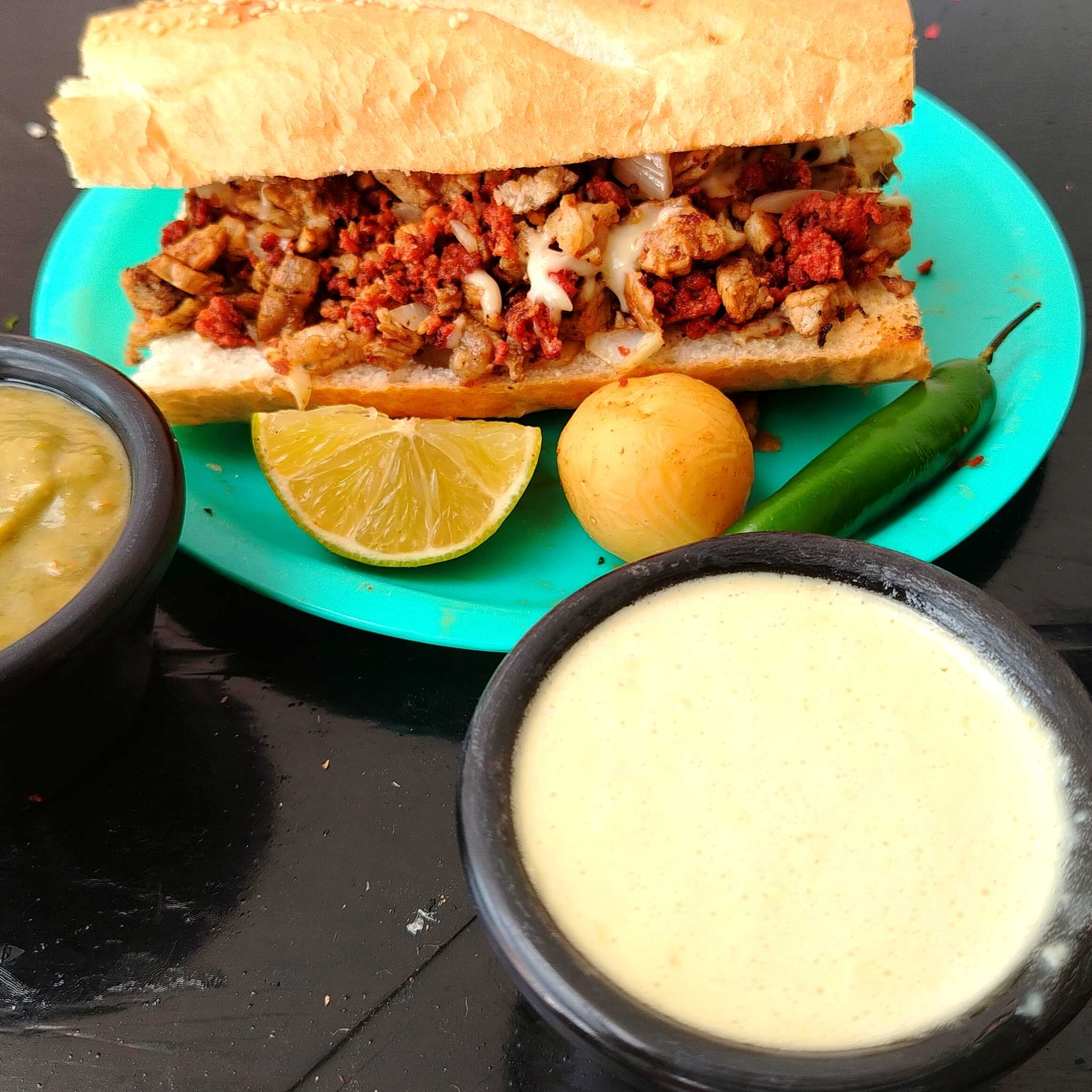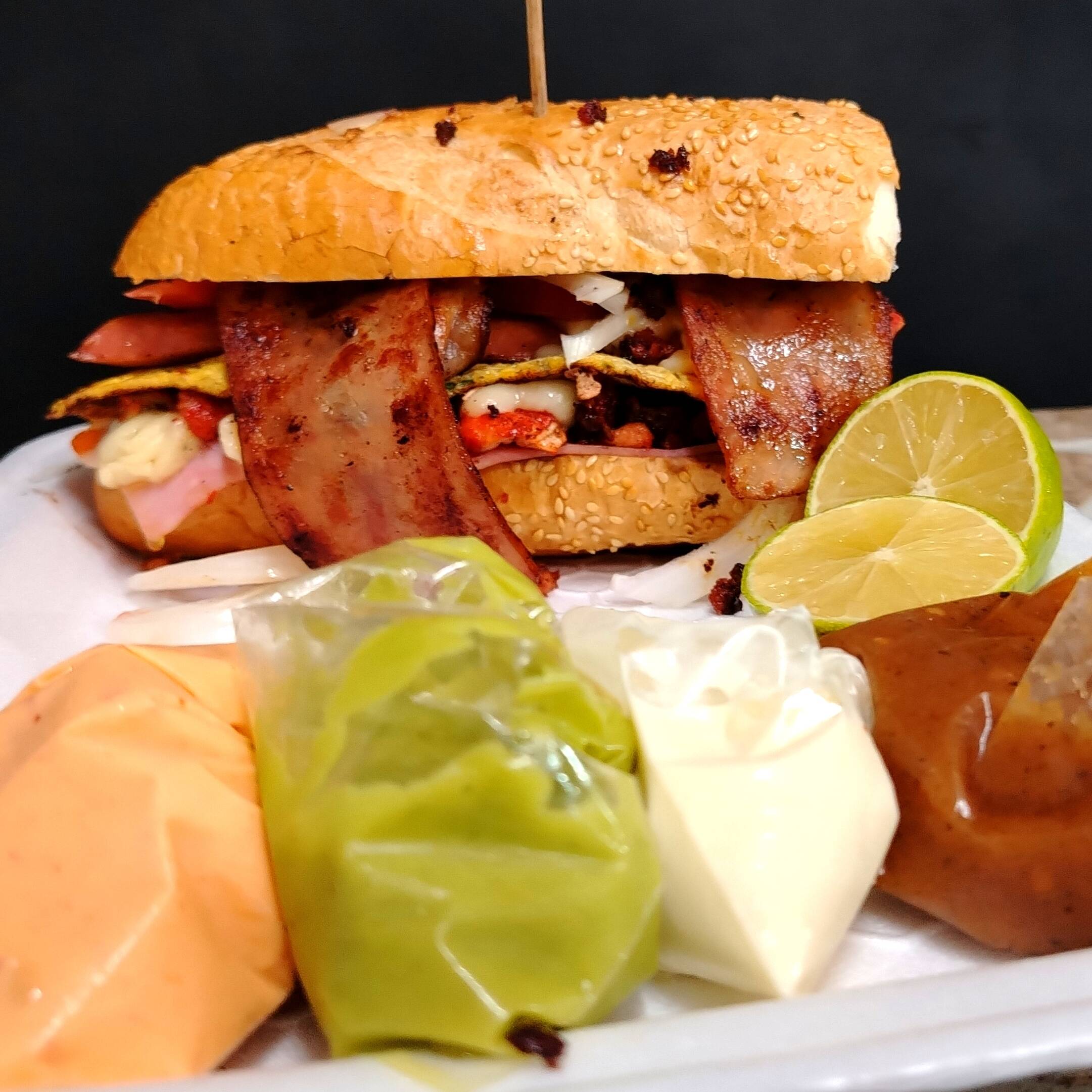 Frijol, mayonesa, jamón, salchichas, jitomate, lechuga, cebolla asada, queso fundido tocineta y longaniza se acompaña con salsas, chile serrano y limón.