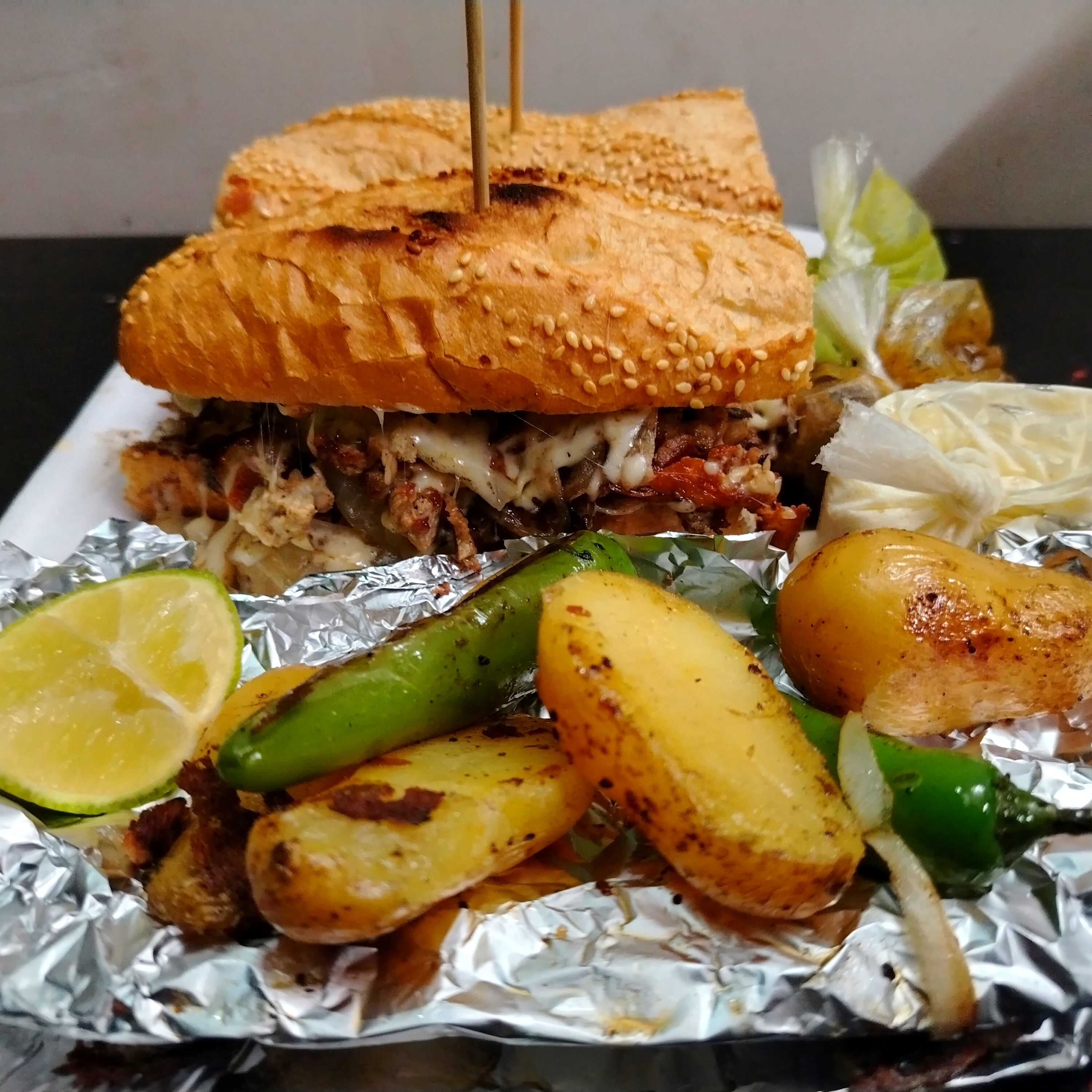 Pan Baguette con ajonjolí, capa de frijol, carne asada de cerdo, queso fundido de alta calidad, cebolla asada, se acompaña con papas cambray al estilo chino, chile serrano, salsa de tomate, guacamole y crema xcatic.