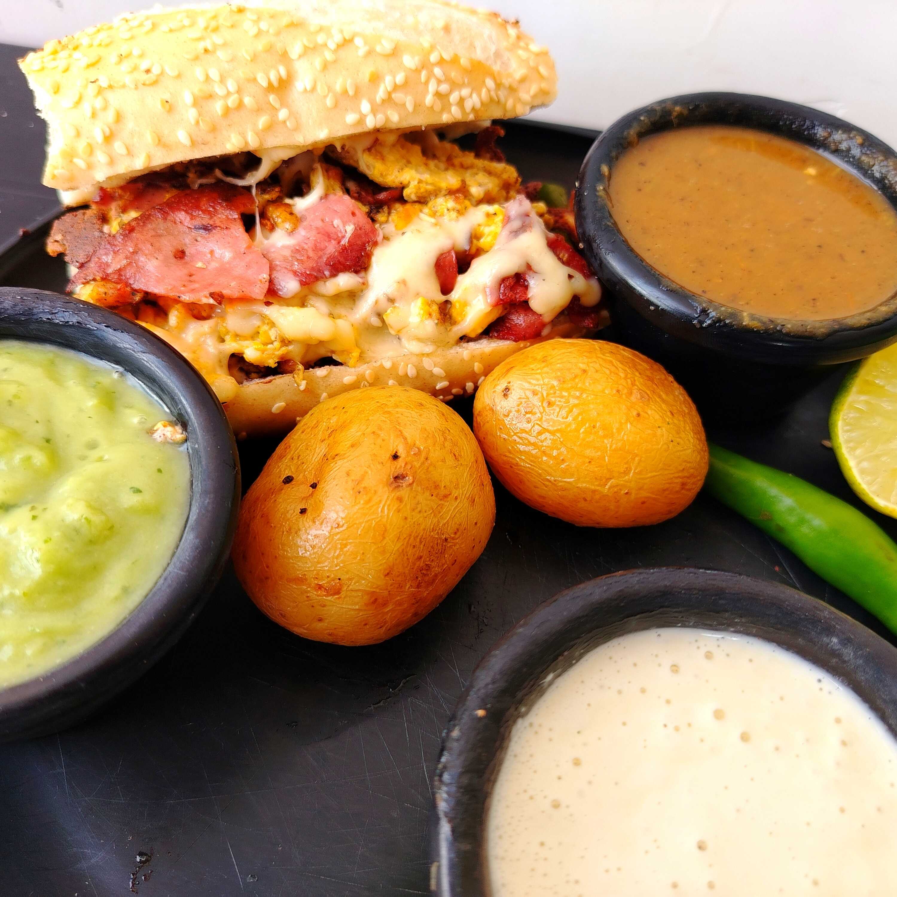 Elaborada con pan baguet con ajonjolí, capa de frijol, huevos revueltos, tocino, queso fundido de alta calidad, se acompaña con papas cambray al estilo chino, chile serrano, salsa de tomate, guacamole y crema xcatic.