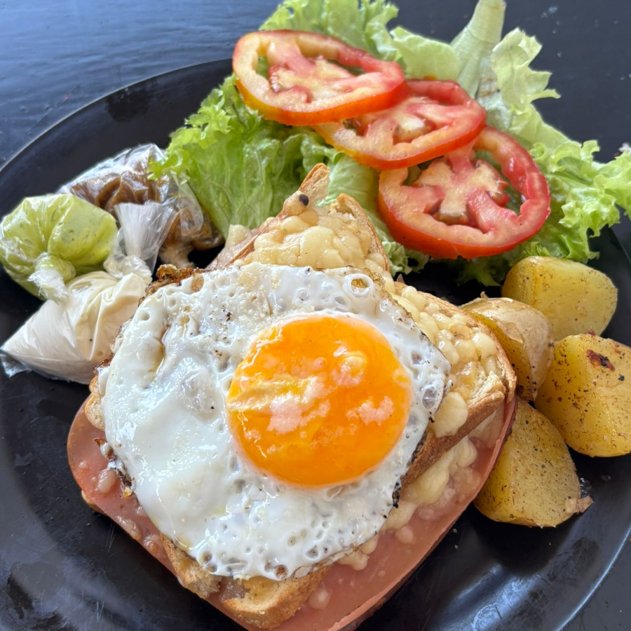 Pan blanco acompañado de salsa bechamel, jamón, queso fundido de alta calidad, huevo estrellado, rodajas de jitomate, lechuga, papas cambray al estilo chino, crema xcatic y salsa de tomate.