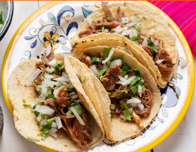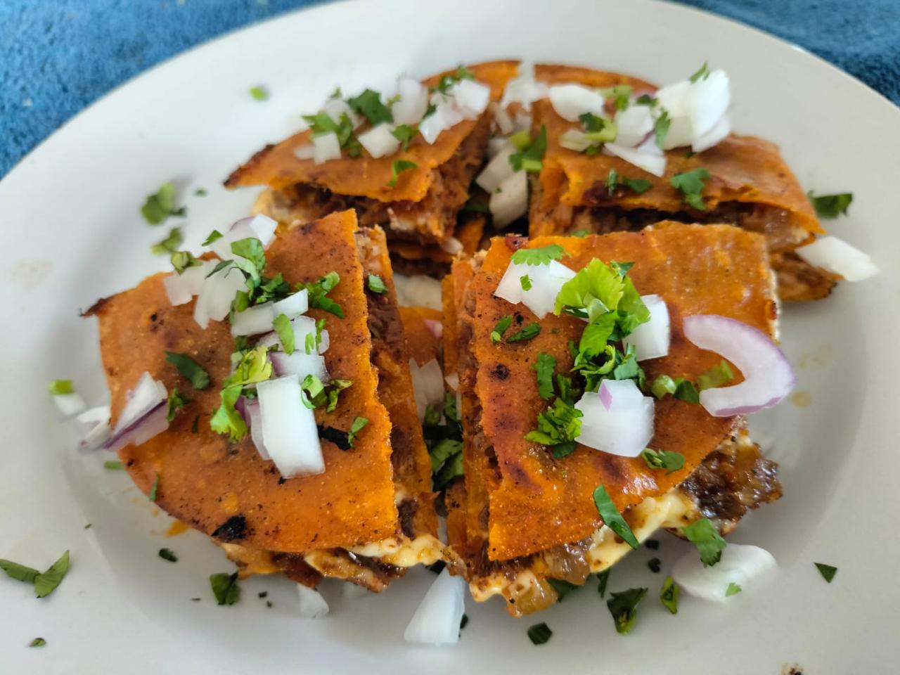 Totopos de maíz fritos con carne de birria, cebolla y cilantro.