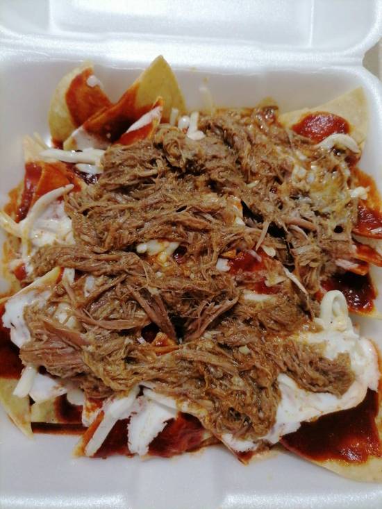 Totopos de maíz fritos con carne de birria, cebolla y cilantro más 1 pieza de huevo estrellado.
