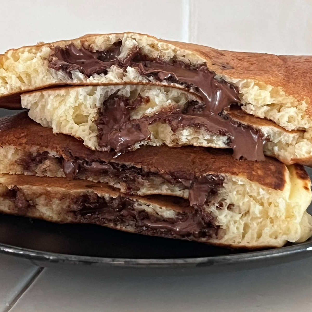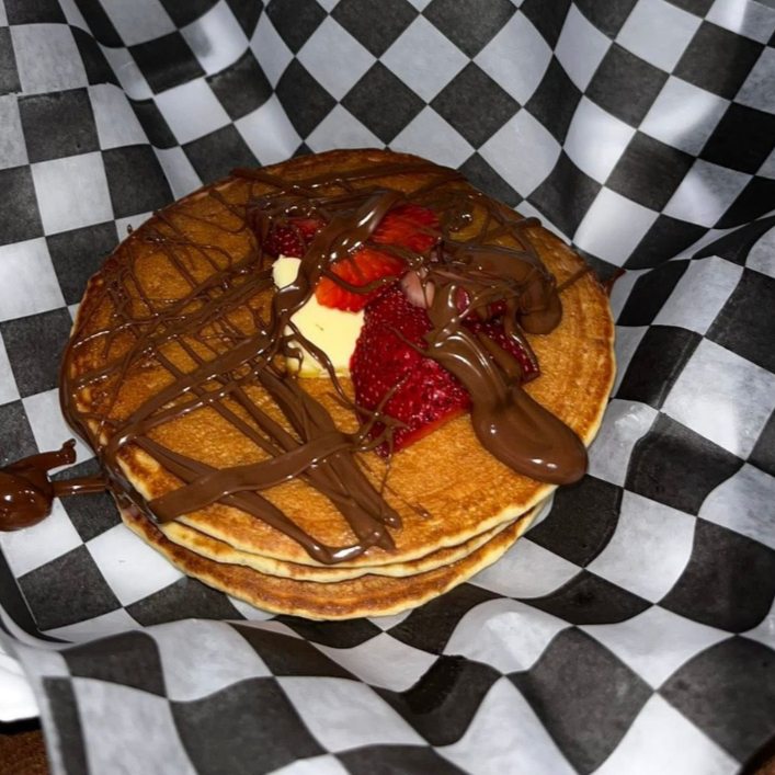 3 Hot Cakes Ricos y Esponjosos Rellenos de Nutella con topping extra a elegir