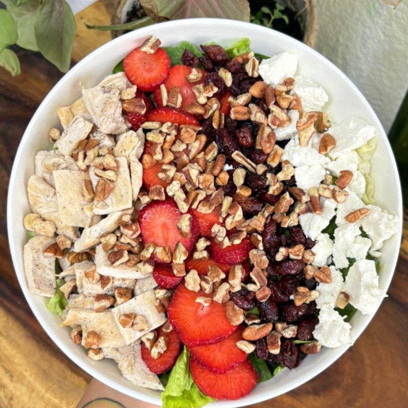 Mix de lechugas y espinaca, Pechuga a la plancha, Queso de cabra, Arandanos, Fresas y Nueces.