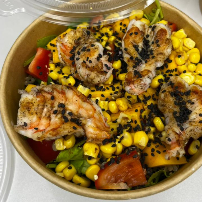 Mix de Lechugas y epinaca, Quinoa al dente con mango fresco, pimiento rojo, elote dulce y cebollín, acompañada de camarones a la plancha, con vinagreta de jengibre y sésamo. Playera, sabrosa y saludable.