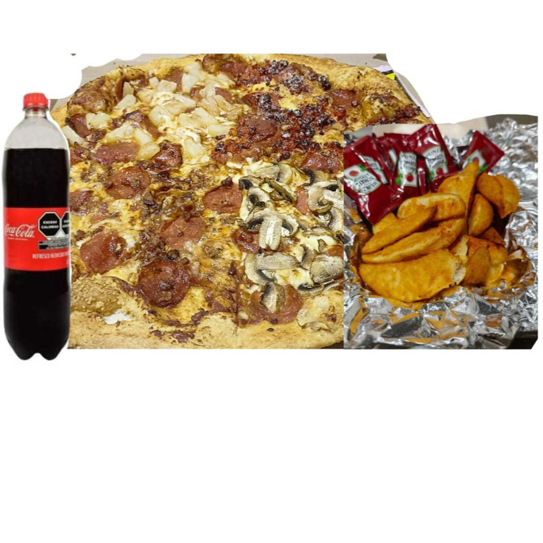 Pizza grande dividido en 1/4 de Pepperoni y piña; 1/4 de Pepperoni y champiñón; 1/4 de Pepperoni y tocino por último un 1/4 de Pepperoni y chorizo. Acompañado de pan con ajo y queso, Orilla parmesano crujiente más una bebida de 1.3 l. Complemento de papas gajo