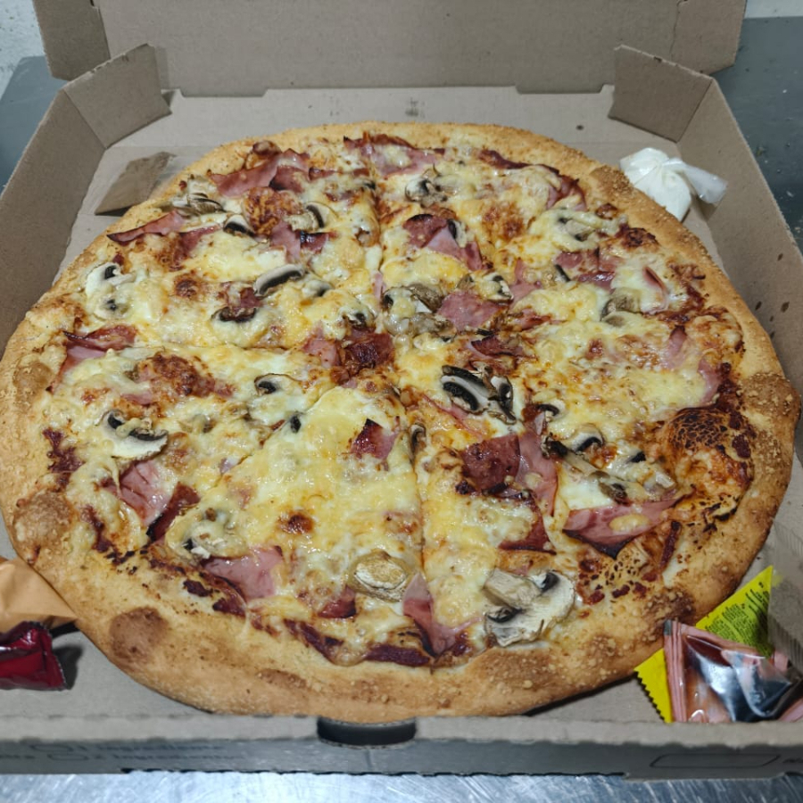 Pizza grande con orilla de parmesano crujiente de ingredientes: jamón, salami, champiñones con extra-queso, acompañado de pan con ajo y queso.