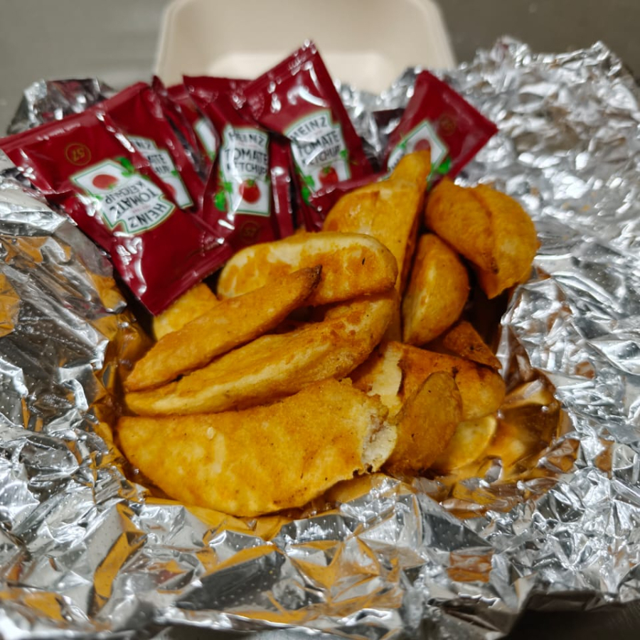 Orden de papas gajo de 300 gr. Hechas a aire caliente. Acompañados de salsa kétchup