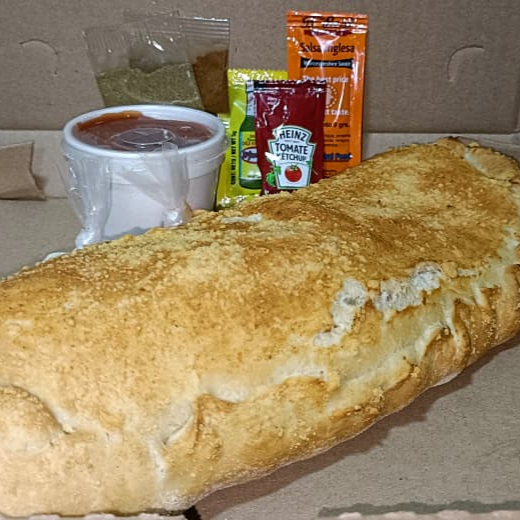 Empanada de 20 a 25 cm, de 3 ingredientes a elegir más queso. En la corteza baño de mantequilla de ajo con queso parmesano. Incluye aderezos de chipotle, de ajo, habanero, inglesa, orégano & chile molido