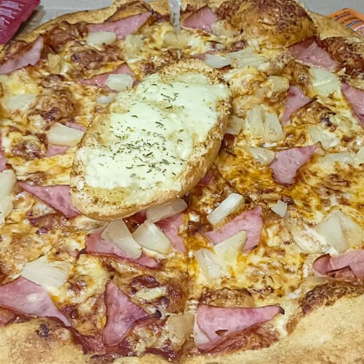 Pizza grande con orilla de parmesano crujiente de ingredientes: jamón, piña con extra-queso, acompañado de pan con ajo y queso.