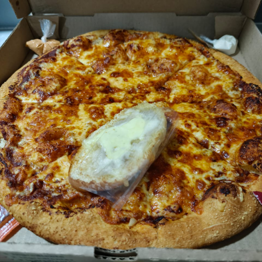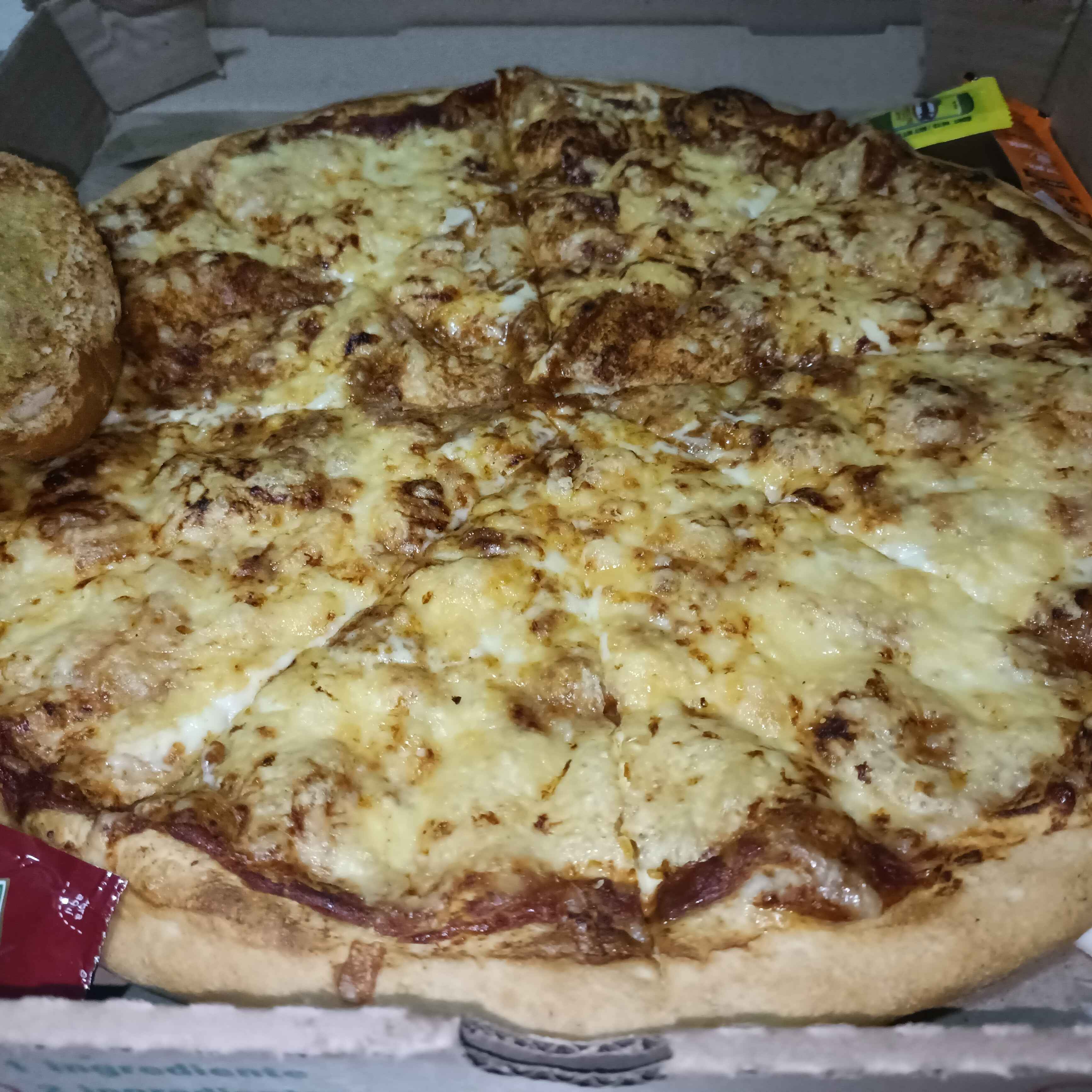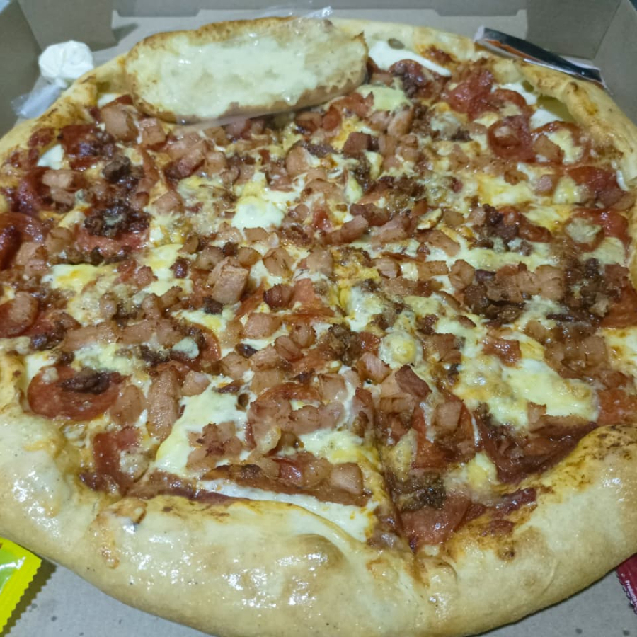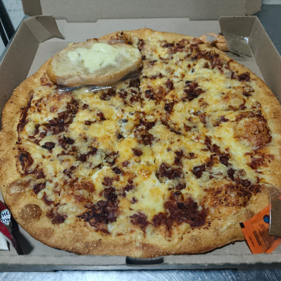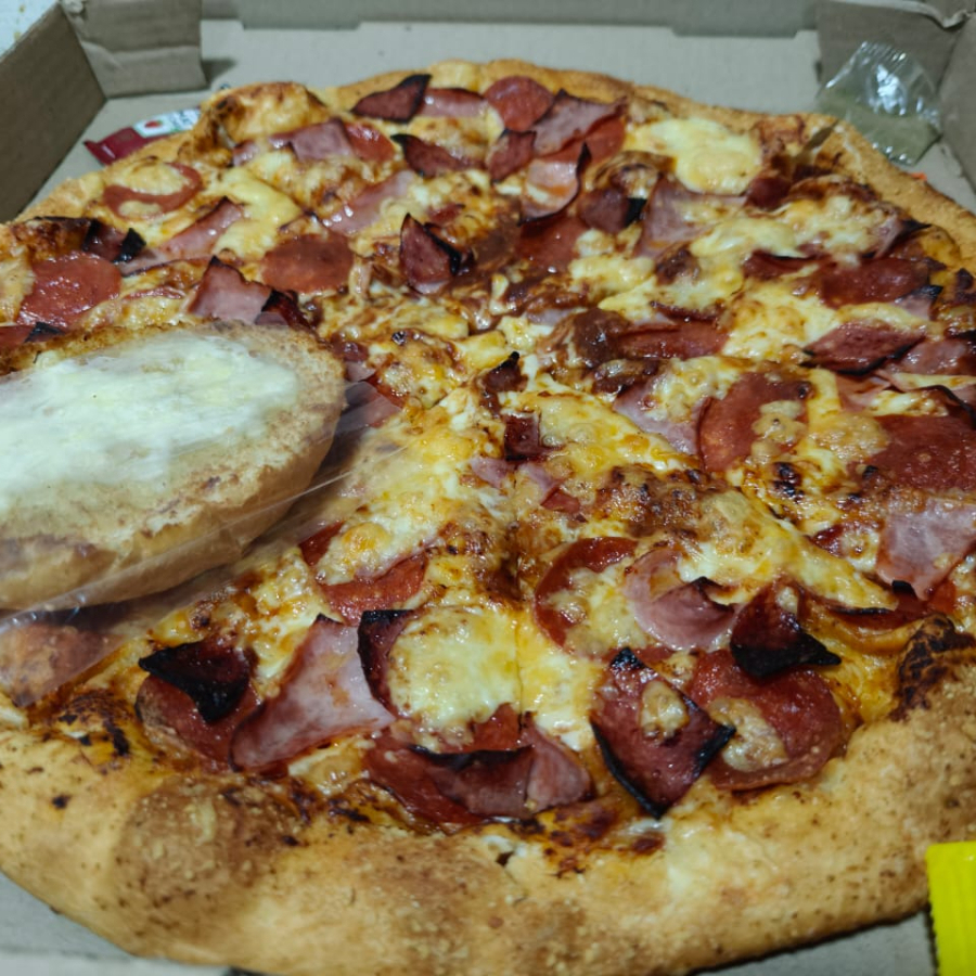 Pizza grande con orilla de parmesano crujiente de ingredientes: Pepperoni, chuleta ahumada, tocino y extra-queso, acompañado de pan con ajo y queso.