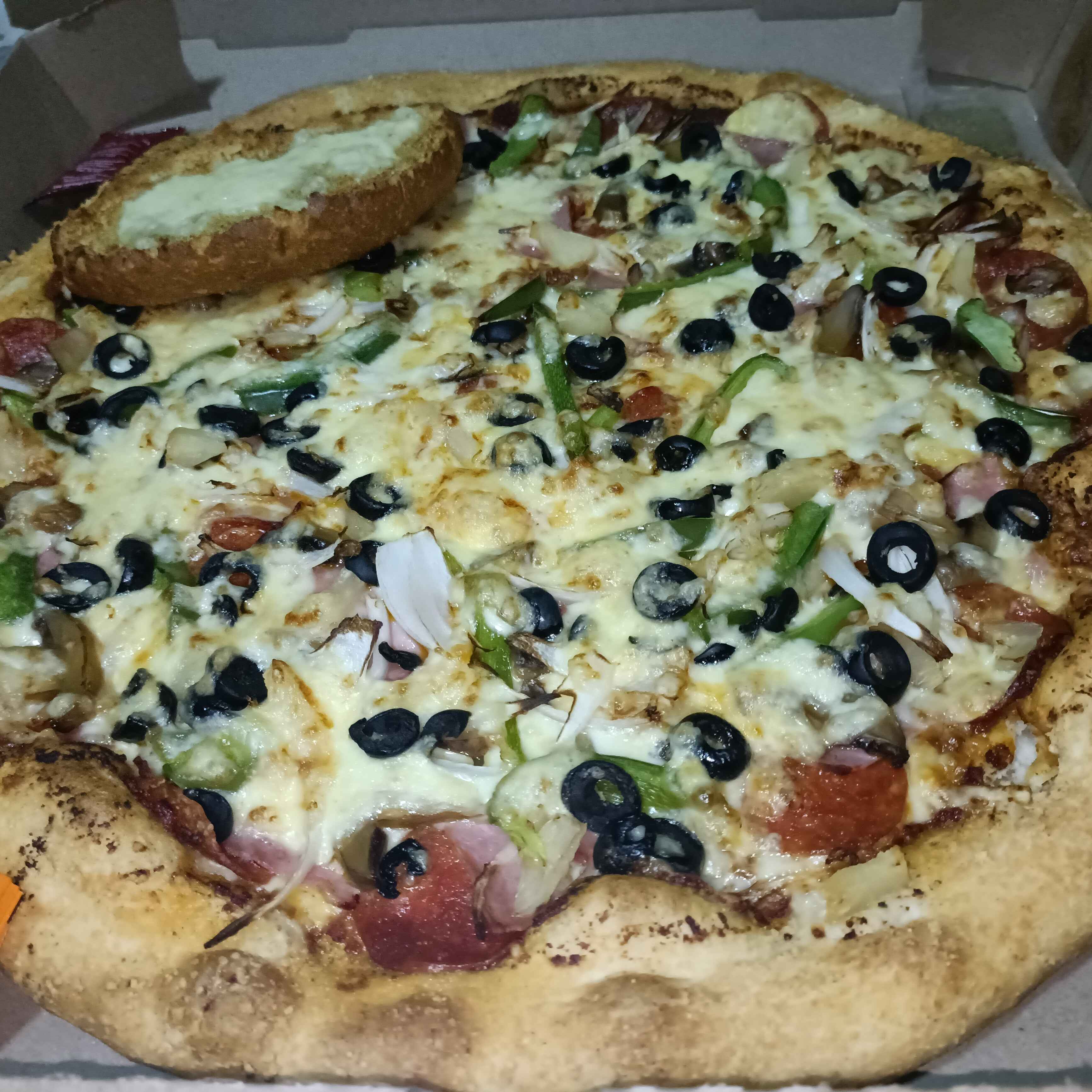 Pizza grande con orilla de parmesano crujiente de ingredientes: pepperoni, jamón, cebolla, pimiento, aceitunas negras, piña, champiñones y extra-queso, acompañado de pan con ajo y queso.