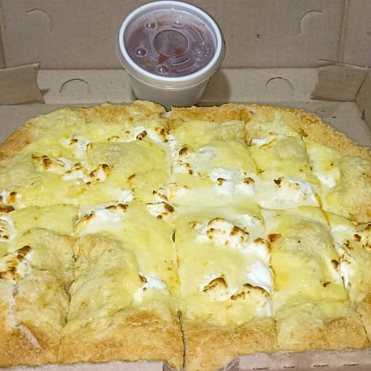 Pizza grande con orilla de parmesano crujiente con ingrediente de 400 gr de queso mixto (Menonita, Cheddar, Mozzarella y Monterrey Jack), acompañado de pan con ajo y queso.