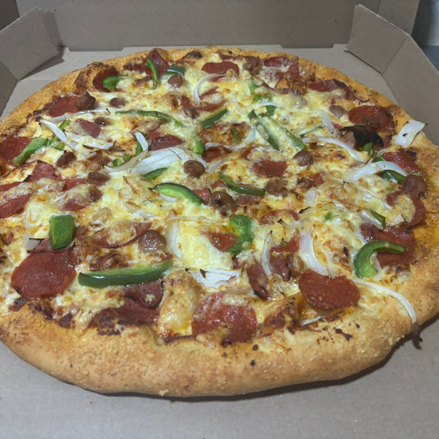 Pizza grande con orilla de parmesano crujiente de ingredientes: pepperoni, salami, cebolla, pimiento, salchicha italiana con extra-queso, acompañado de pan con ajo y queso.