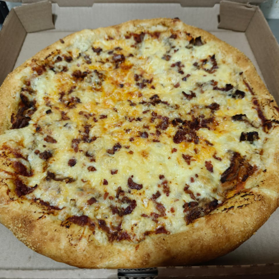 Pizza grande con orilla de parmesano crujiente con ingrediente de 120 gr de tocino con 360 gr de queso acompañado de pan con ajo y queso.