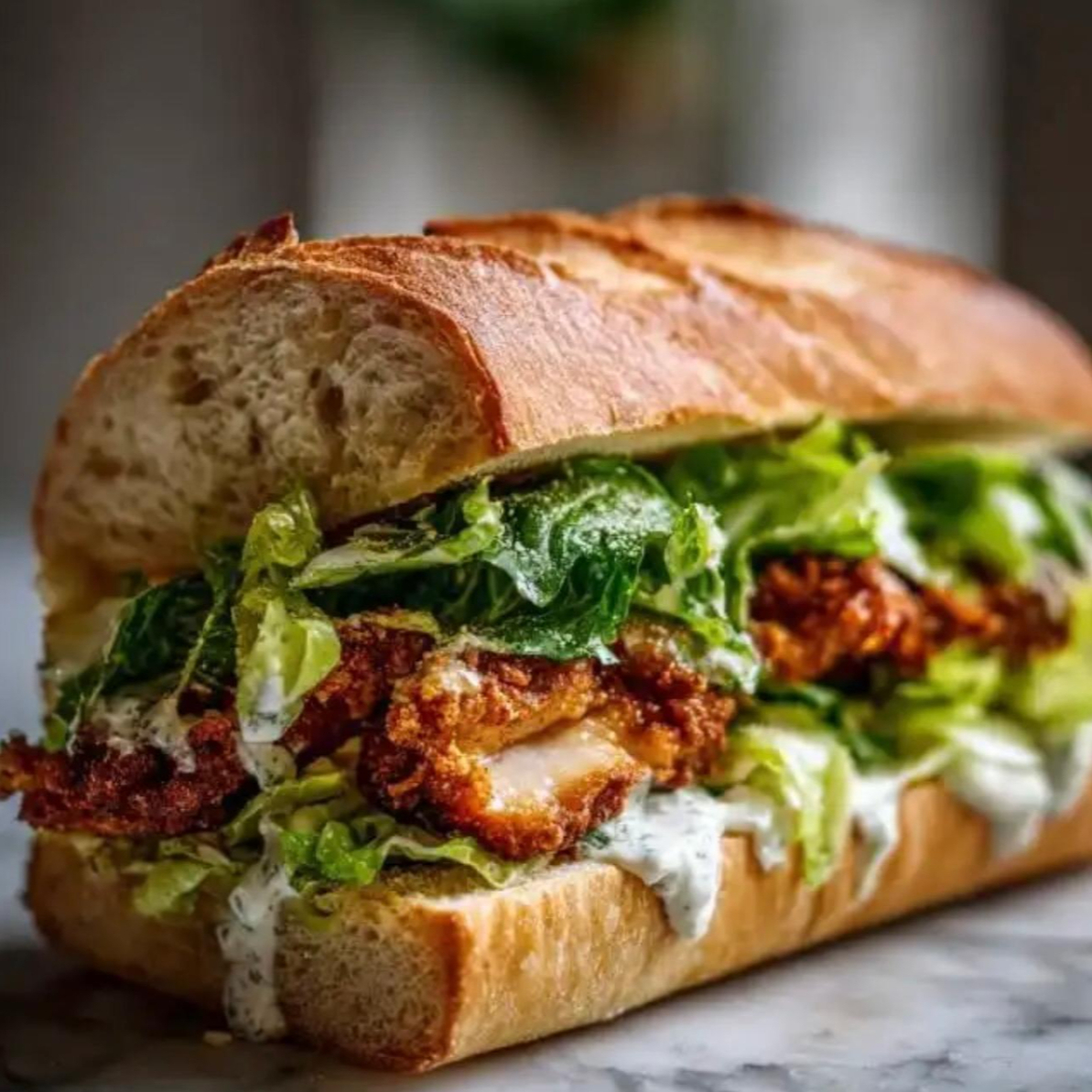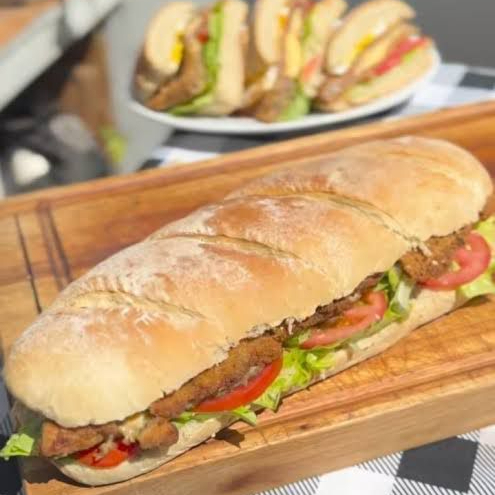Baguette crujiente rellena de pollo empanizado doradito, jamón y queso derretido. Calientita, crujiente por fuera y suave por dentro, ¡súper antojable!