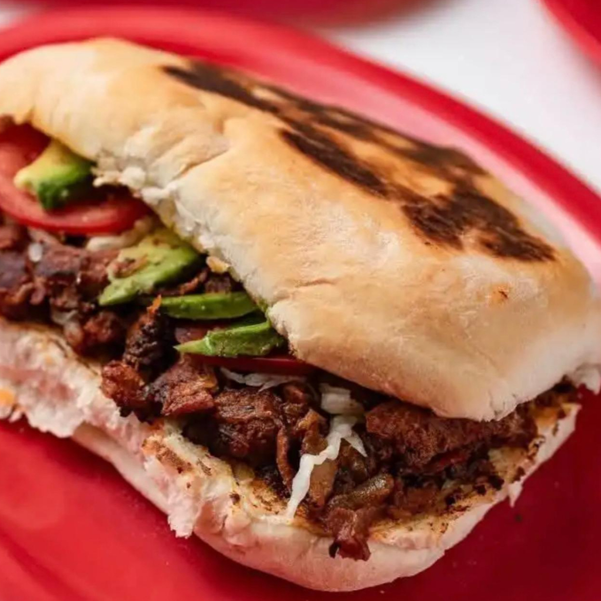 🔥 Torta de puerco rojo 🔥 Carne de puerco marinada en adobo rojo, cocinada al punto justo para quedar suave y llena de carácter, servida en pan recién calentado. 🥪🤤 Sabores profundos, color irresistible y puro antojo en cada mordida.