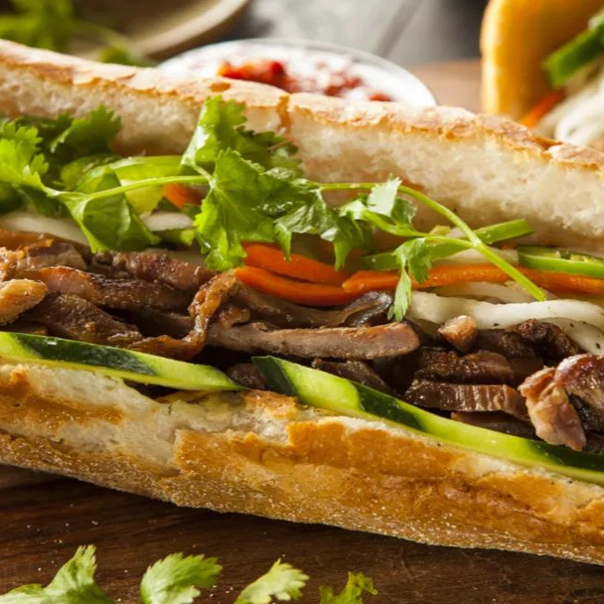 Baguette crujiente rellena de puerco rojo bien sazonado, jamón y queso derretido. Calientita, llenadora y con todo el sabor casero que te encanta.