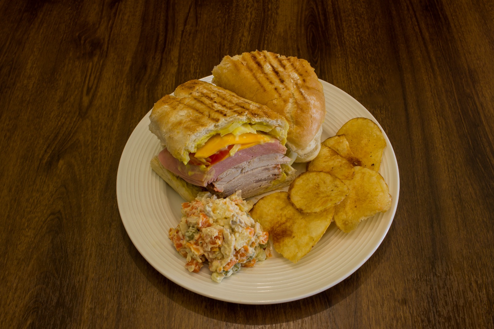 Pan blanco relleno de pierna , jamón,queso, mayonesa, mostaza , tomate y cebolla
