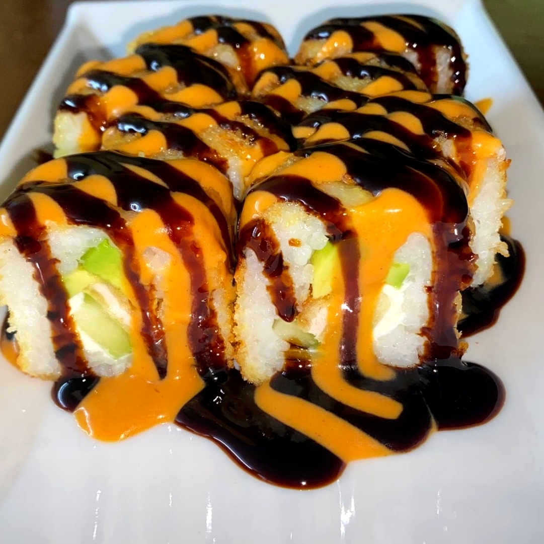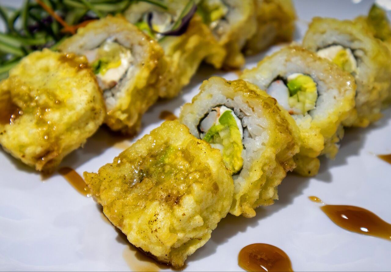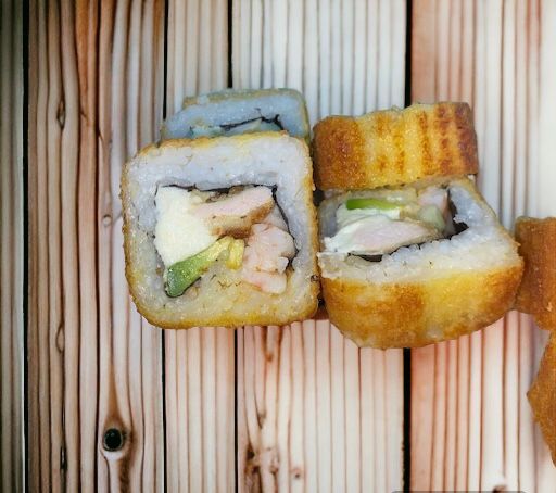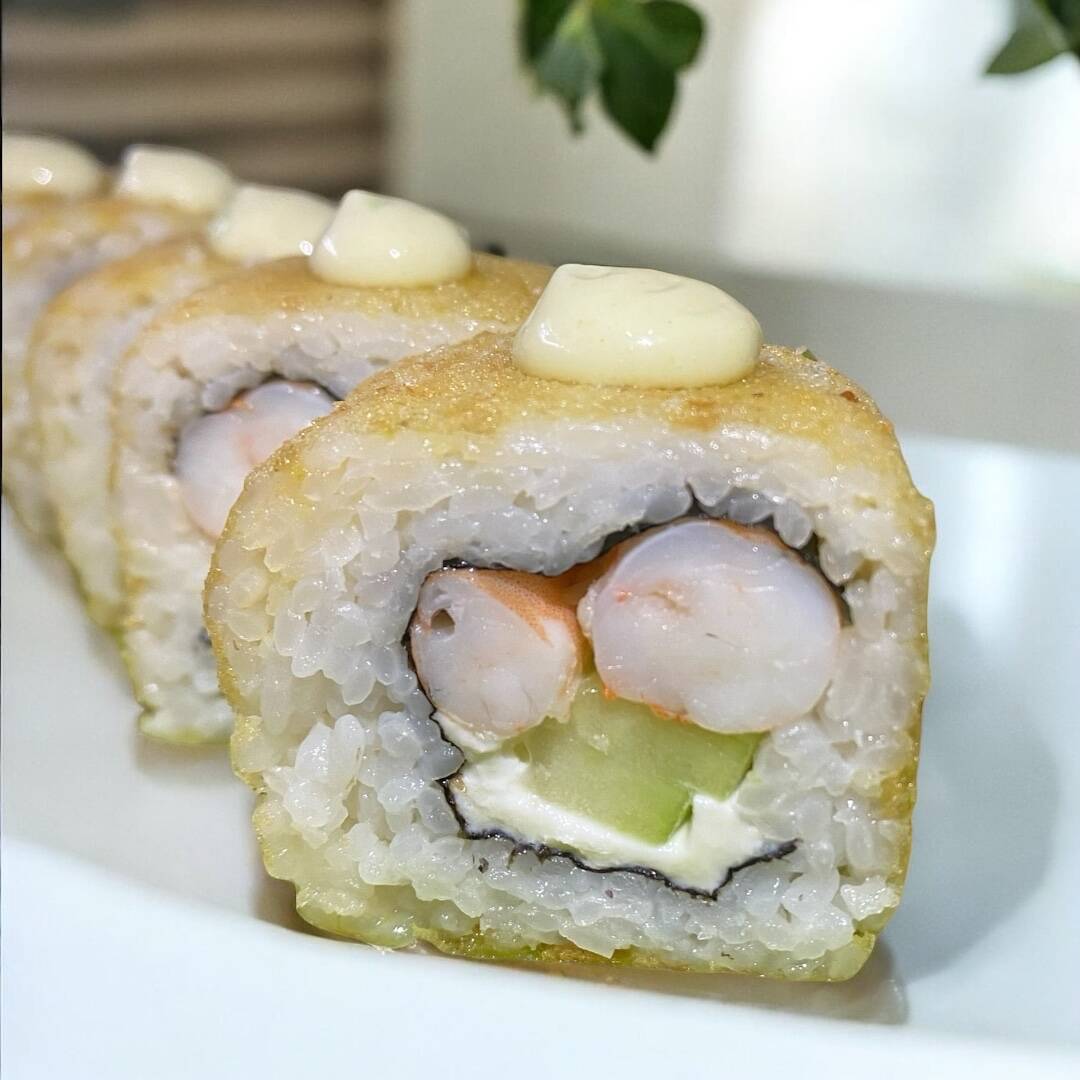 Por dentro con Philadelphia, aguacate, pepino, pollo y camarón, por fuera con alga nori y tempurizado.