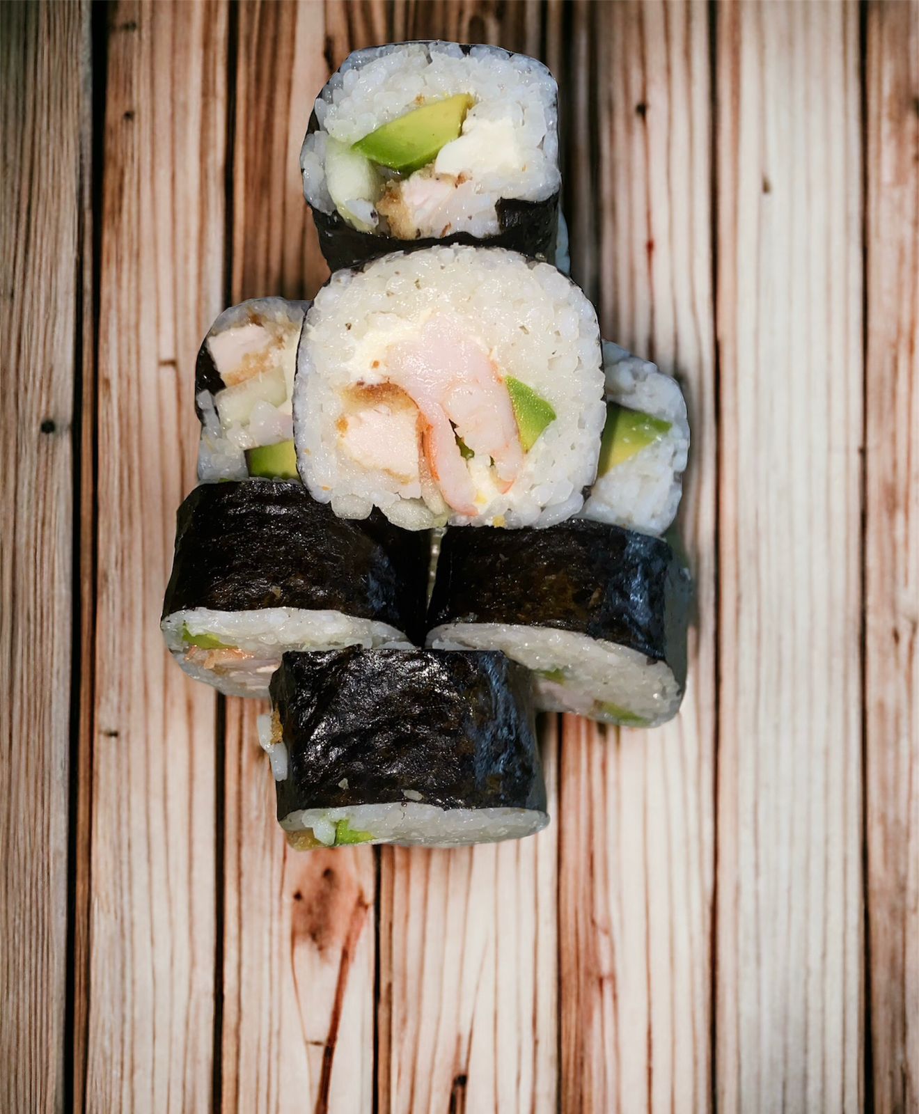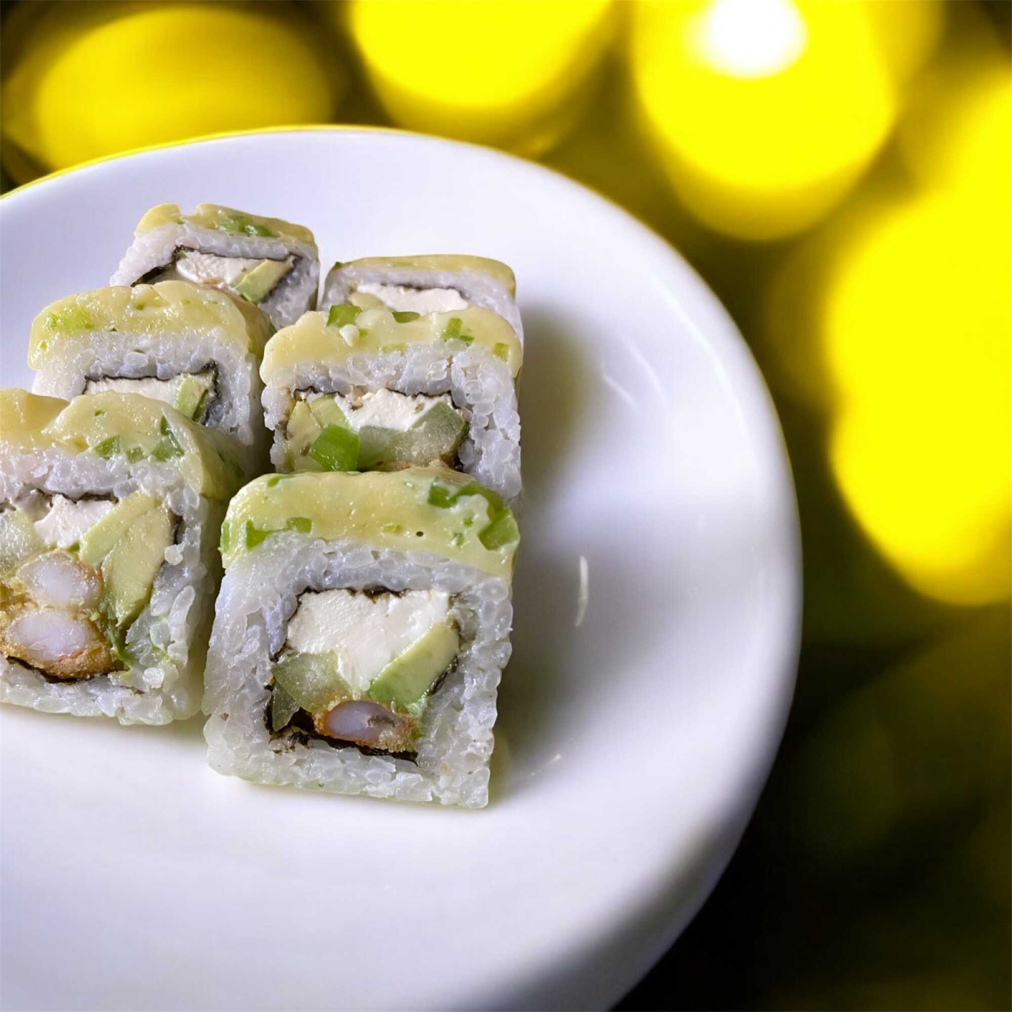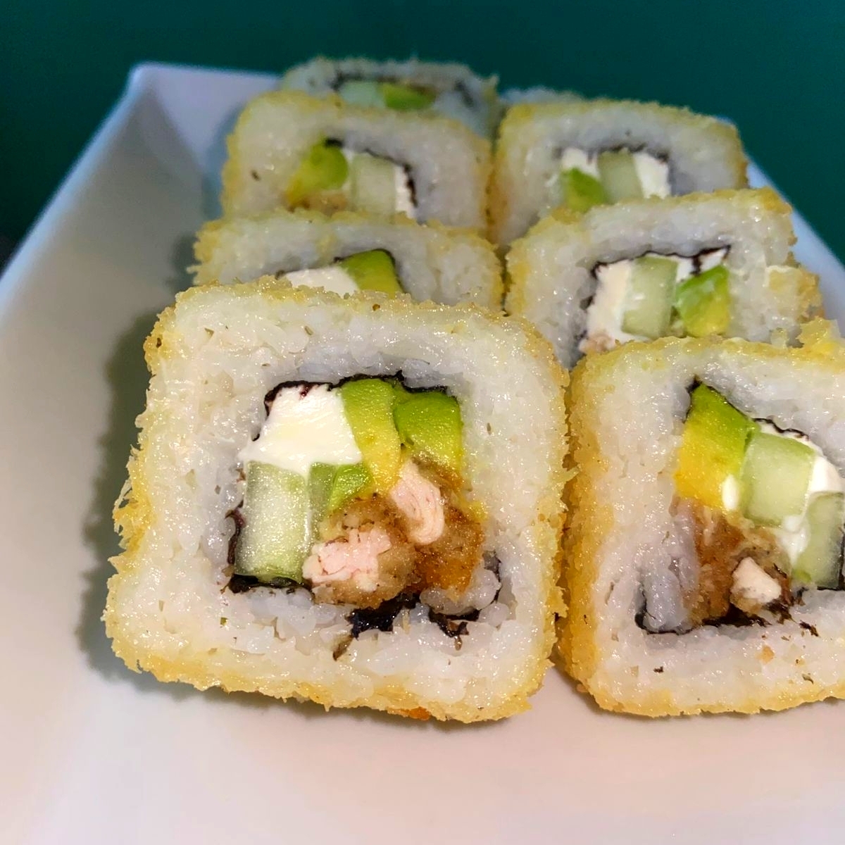 Por dentro con Philadelphia, aguacate, pepino, pollo y camarón, por fuera con alga nori y tempurizado.