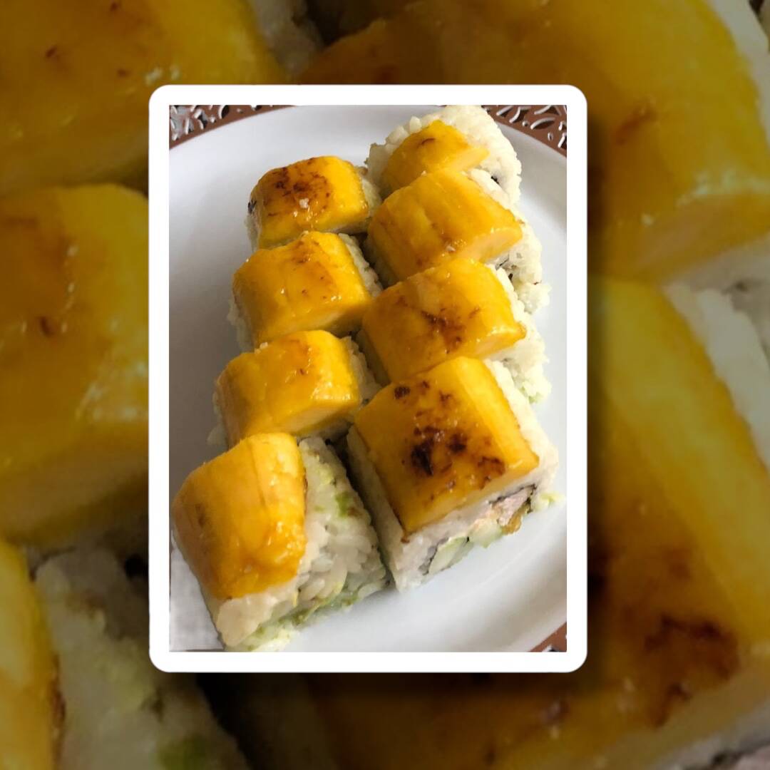 Por dentro con philadelphia, aguacate, pepino y surimi , Por fuera plátano frito.