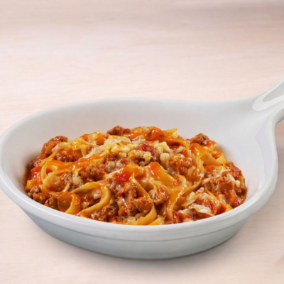 Bañados en salsa Roja, con queso gouda gratinado, crema y cebolla.