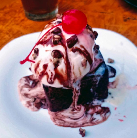 Brownie de chocolate con jarabe de chocolate, helado de vainilla, decorado con nuez y una cereza
