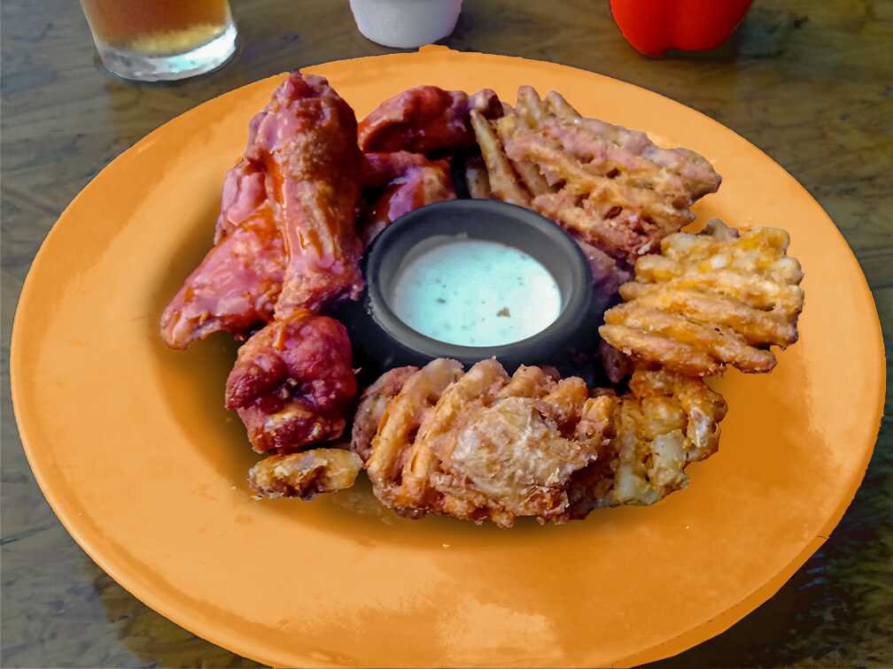 12 Piezas de alitas de pollo con salsa a elegir acompañados de papas fritas.