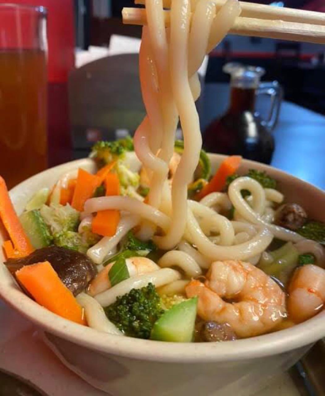 Fideo de udon en consomé de pescado, camarones capeados tempura, champiñones, espinaca y sake.