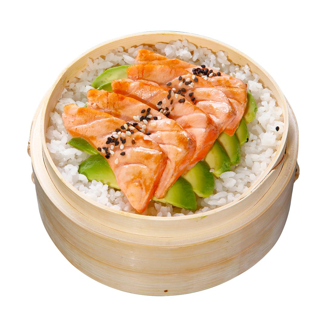 Arroz al vapor, spicy con salmón.