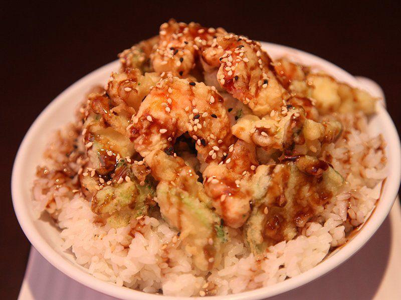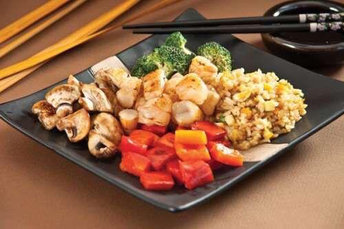 Carne y verdura salteados en salsa teriyaki acompañado de arroz gohan, de camarón.