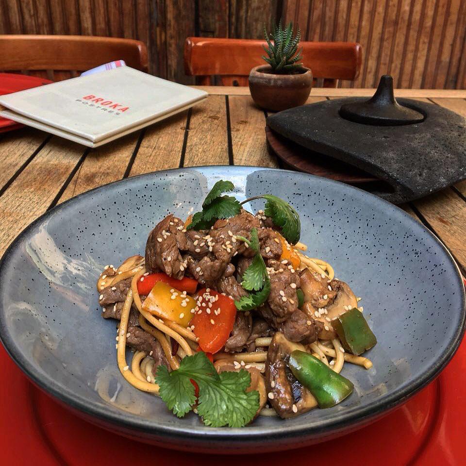 Pasta udon con verduras y sake en la original salsa teriyaky con arrachera.