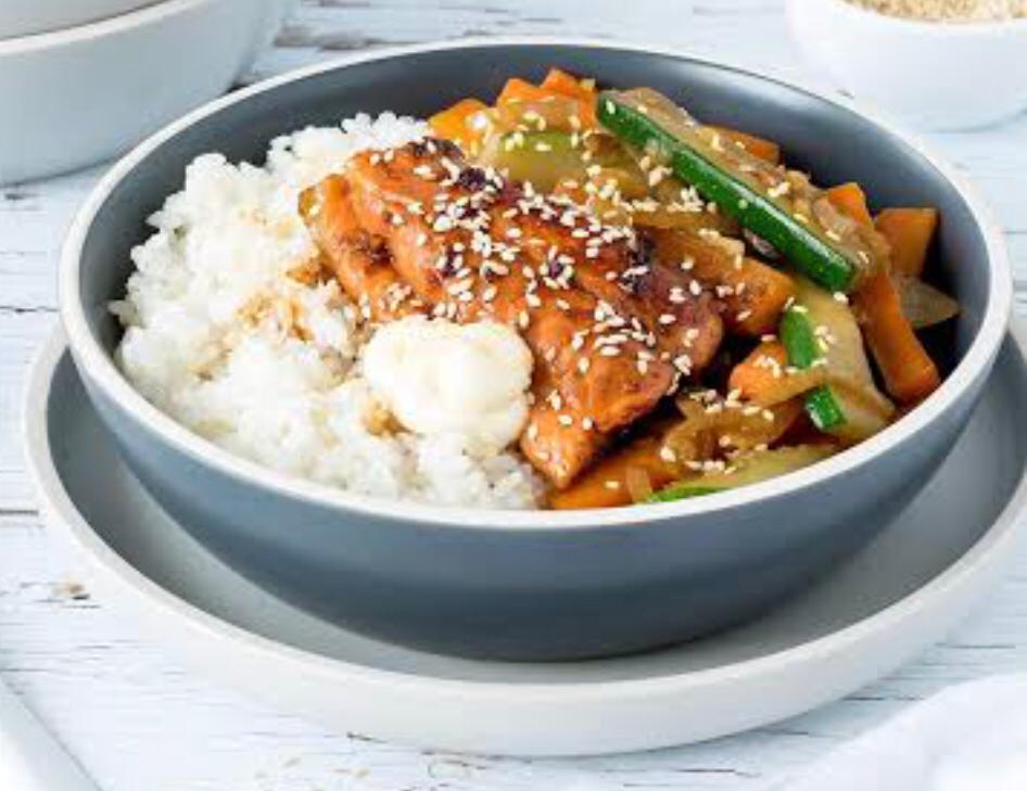 Carne y verdura salteados en salsa teriyaki acompañado de arroz gohan, de salmón.