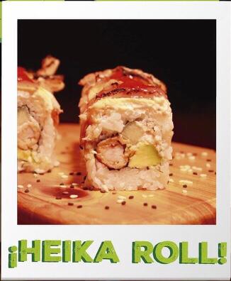 Por fuera camarón, aguacate, pepino y philadelphia. Por dentro kanikama, masago habanero, masago, salmón, pulpo y atún.