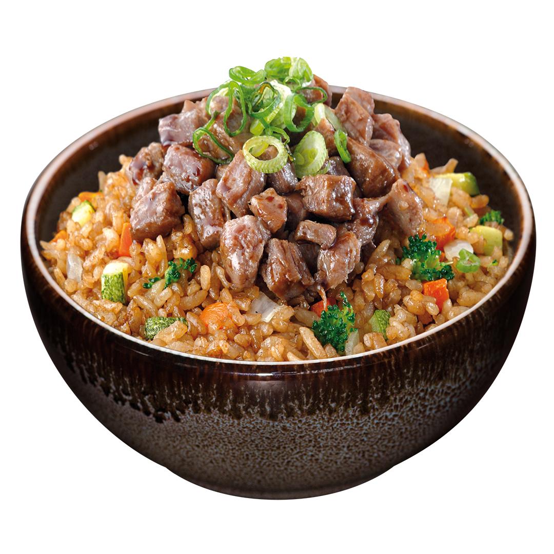 Carne y verdura salteados en salsa teriyaki acompañado de arroz gohan, de pollo.