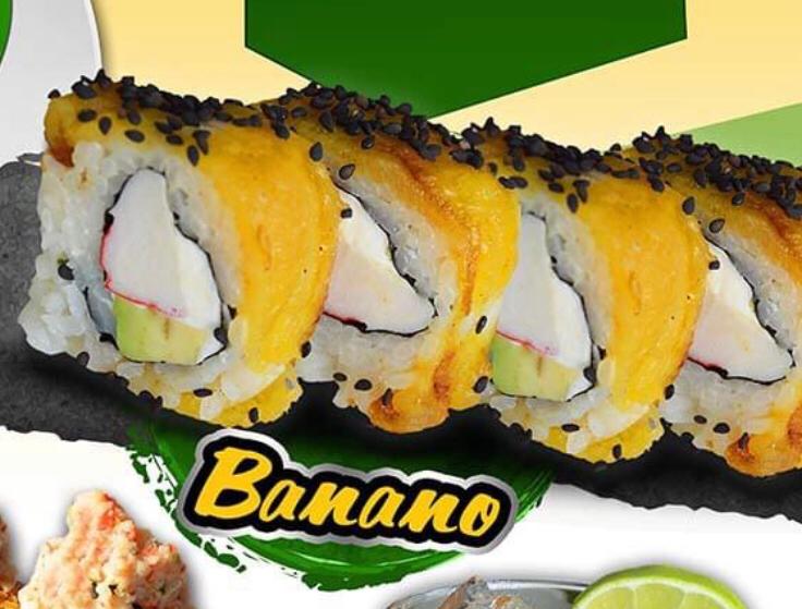 Por fuera plátano macho frito y ajonjolí negro. Por dentro camarón, aguacate, philadelphia y pepino.