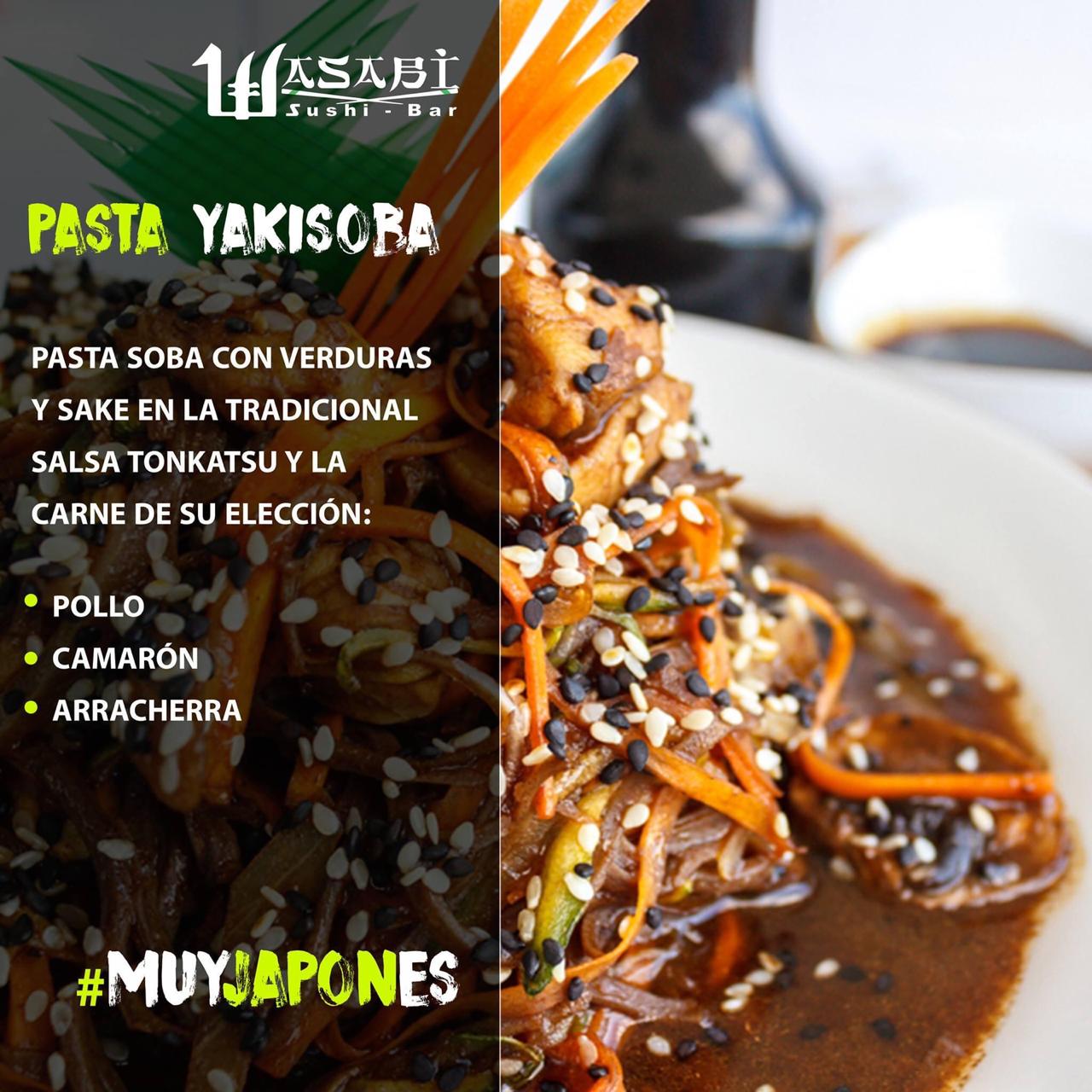 Pasta soba con verduras y sake en la tradicional salsa tonkatsu con arrachera.