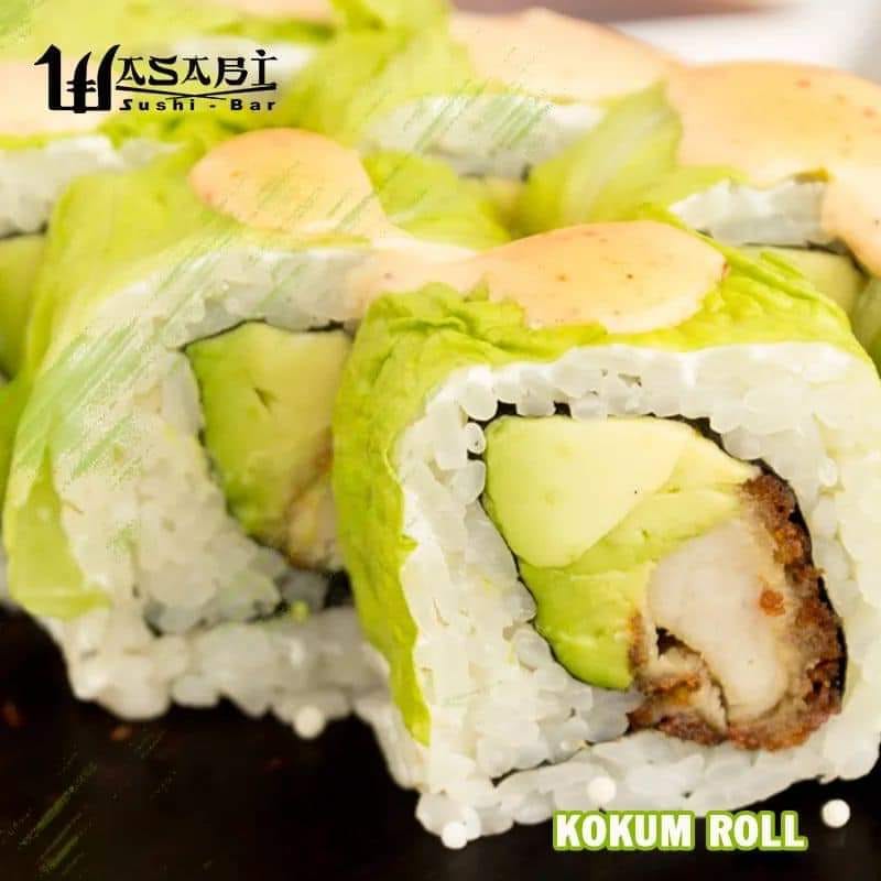 Por fuera aguacate y tampico punteado con salsa tártara. Por dentro camarón empanizado, surimi y pepino.