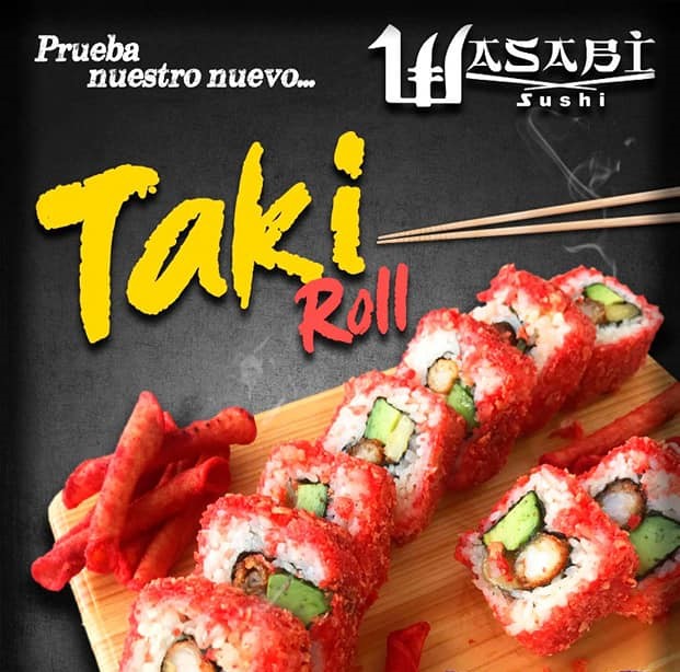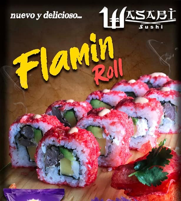 Por fuera Philadelphia y Takis. Por dentro camarón, aguacate y queso gouda.