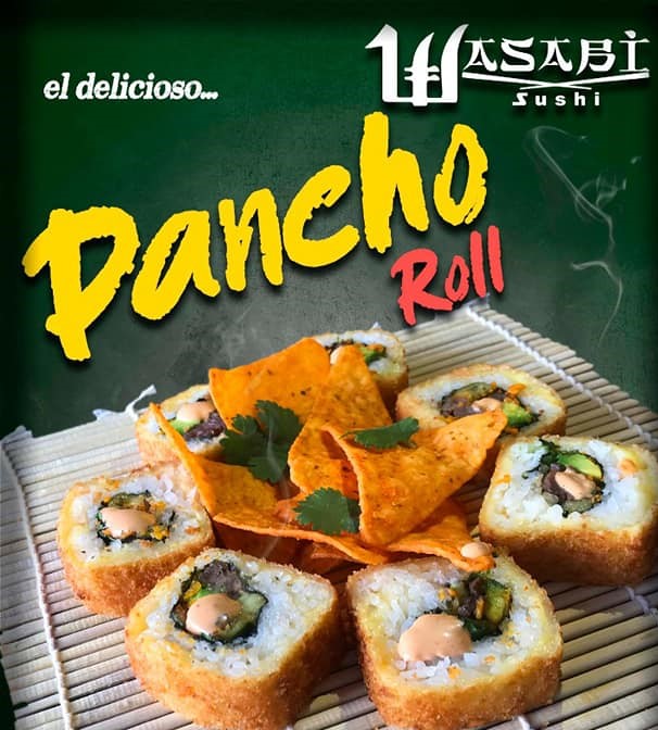 Por fuera camarón empanizado, aguacate, Philadelphia, tampico y chipotle punteado con sriracha. Por dentro pepino surimi y Philadelphia.