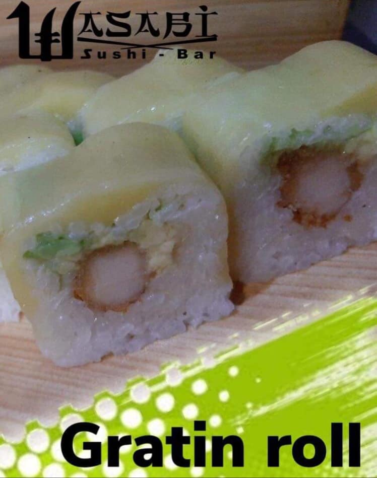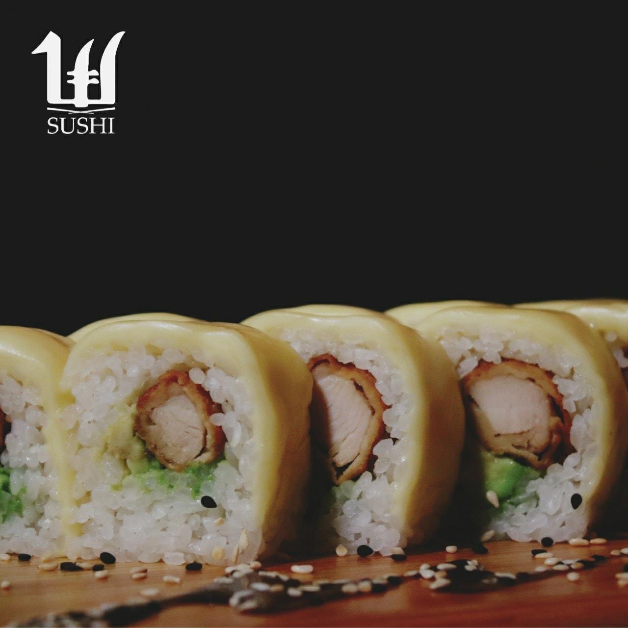 Por fuera queso spicy gratinado y salsa de anguila. Por dentro camarón empanizado, aguacate y Philadelphia.