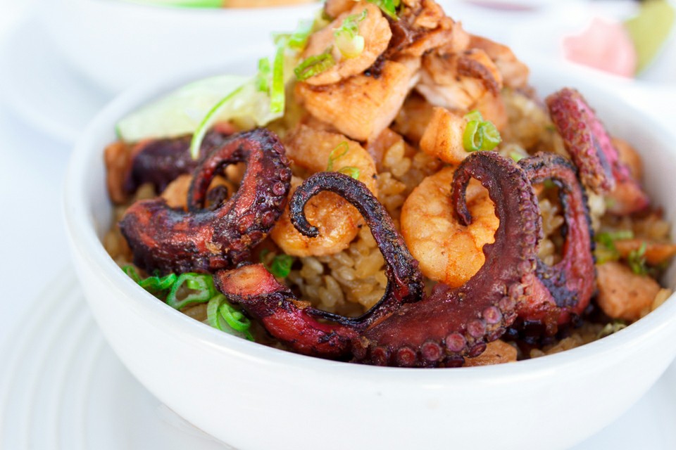 Carne y verdura salteados en salsa teriyaki acompañado de arroz aohan, de camarón.